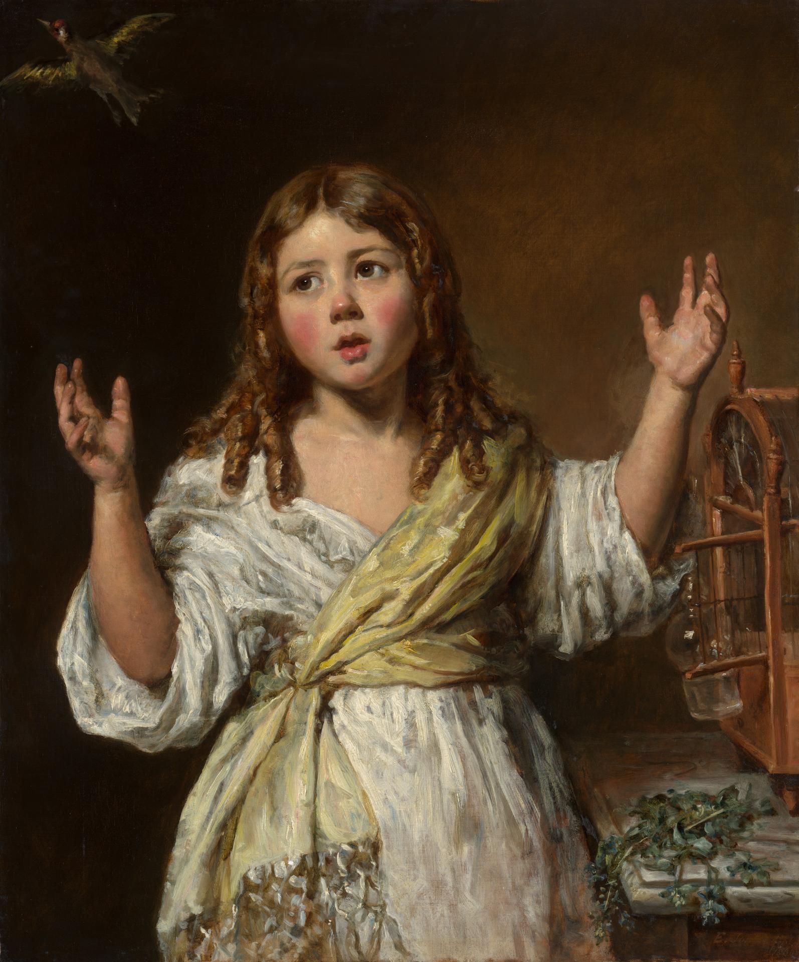Women in the Regency and Georgian periods who wanted to pursue art seriously were largely reliant on family members as the source of education. Soyer – then Jones – commenced her art training with her stepfather, Belgian painter François Simonau, and immediately showed a proficiency for portraiture. With her mother’s urging, Soyer became Simonau’s sole pupil and, in 1823, she exhibited her first work, Portrait of Miss Bennett, at the Royal Academy’s Summer Exhibition at just ten years of age. Soyer started taking portrait commissions soon after, presumably working from her stepfather’s established portrait studio. Her style and use of colour, light and shade were likened to that of seventeenth-century Spanish painter Bartolomé Murillo, particularly in her studies of children. Recently gifted to the NGV by Krystyna Campbell-Pretty AM and Family, The escape, 1837, is a characteristic example of Soyer’s empathetic renderings of child subjects that, in this case, blend realism with allegory.