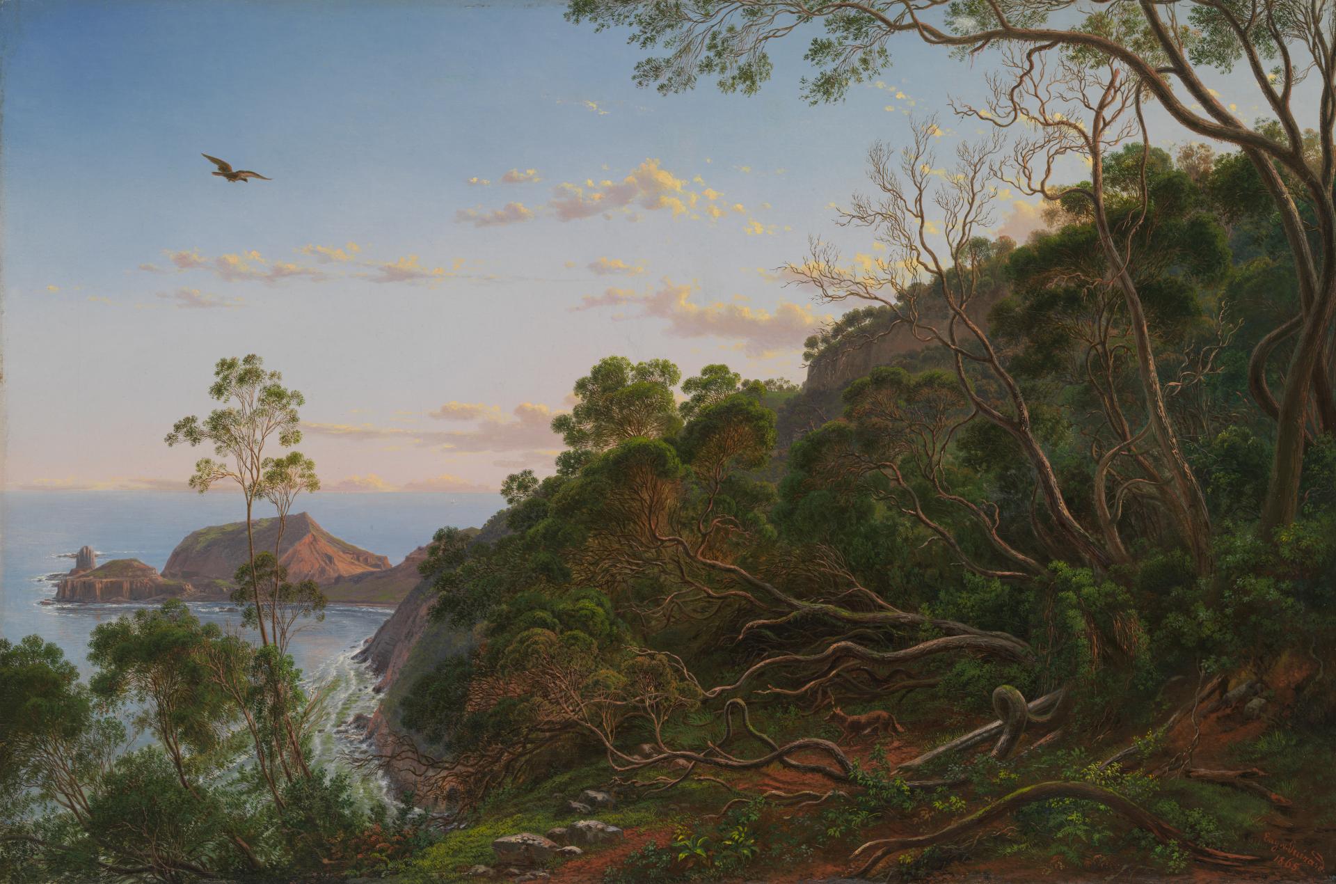 Early in August 1855, Eugene von Guérard was travelling by steamer towards his Melbourne home, returning from an extended sketching tour through South Australia. On 3 August, he disembarked west of Warrnambool at Portland Bay, and within three days he had travelled approximately 100km to the north. From here – at the top of Mount Rouse – he made his first sketch of the Grampians mountain range. We can retrace these movements by studying one of the sketchbooks that he took with him to record views of his journey. In the collection of the State Library of New South Wales’ Mitchell Library—this entire book can be viewed here—Von Guérard then retraced his steps back to the coast, passing through a sheep station known as Kangatong. The owner of this property was James Dawson, who also had a residence and commercial interests near Port Fairy. Dawson commissioned von Guérard to paint a view of the nearby extinct volcano known as Tower Hill.