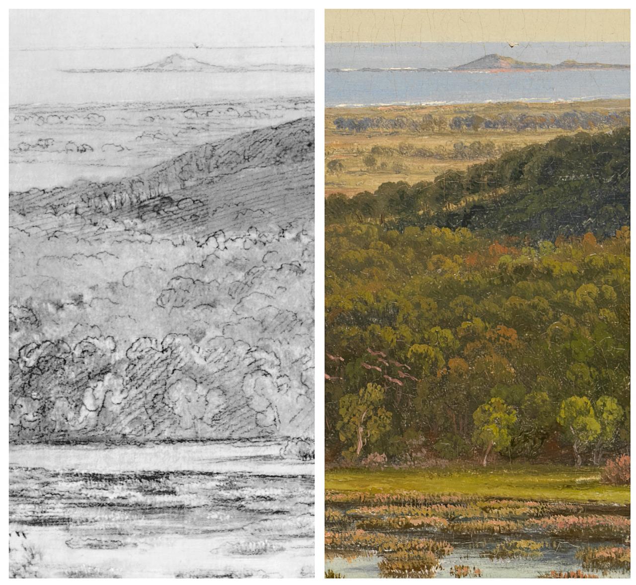 In order to undertake the painting in his Melbourne studio, von Guérard would have made a large detailed drawing and possibly colour studies of this scene over 9 and 10 August, before continuing his homeward voyage by steamer. Within two days of his return on 12 August, he had prepared a blank canvas and was ready to begin the painting, presumably acting with haste to ensure its completion and reimbursement with Dawson.
