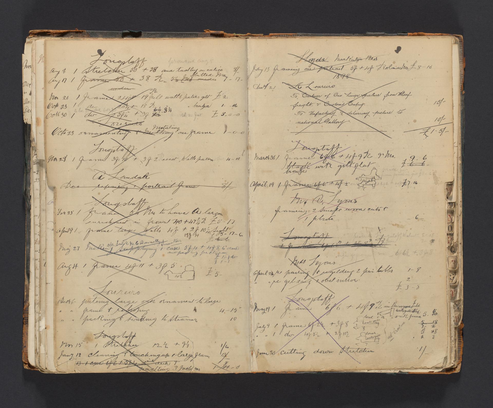 Generally, only the day and month are recorded in the first column of the ledger, however, a number of entries have the year noted in the main text, mostly in relation to the payment date. Using this information, the year of nearby entries is indicated. Sometime after the last entry in 1903, groups of pages in the first section of the book were glued together to create rigid supports on which a series of photographs and illustrations were mounted. These include black and white photographs of frames and furniture pieces and pages cut out from frame moulding and ornament catalogues.2One of the catalogue pages appears to bear the emblem of London frame maker Richard Scully, as reproduced in Jacob Simon, The art of the picture frame, National Portrait Gallery London, 1996, p.45. Unfortunately, this means that most entries for clients with names beginning A to F are unable to be accessed.