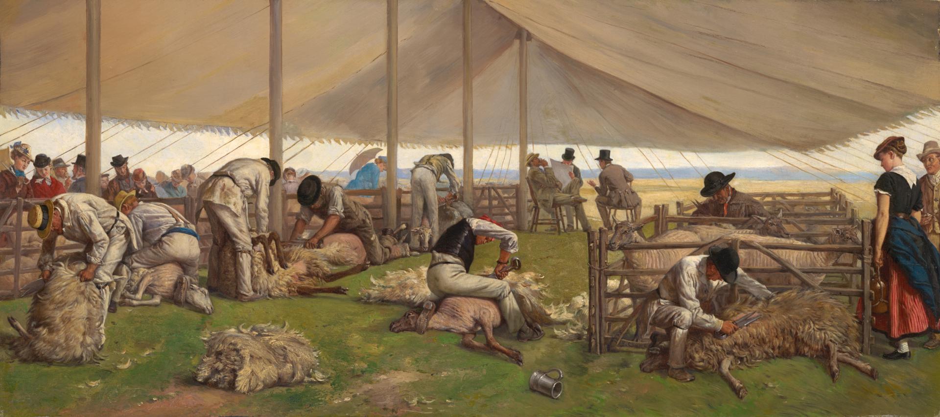 A sheep shearing match was selected for exhibition at the Royal Academy in 1875 and it exemplifies Crowe’s genre paintings of the 1870s. He has painted the scene with his typically beguiling realism which underscores a discreet socio-political theme. Unlike the approach often taken by many of his contemporaries, he has portrayed workers in a positive way that is not overly romanticised, clichéd or patronising. He explores the dynamic of a shearing contest at a country fair, a traditional setting for shearers to publicly demonstrate their abilities. The painting is a celebration of the immense skill of their labours carried out with relaxed confidence. Crowe has also included a degree of social commentary: at the back of the tent a group of men, most likely landowners, are conspicuously positioned, ignoring the physical labour behind them. This device was also used by Tom Roberts in his paintings of shearing sheds to reinforce the class distinctions between station owners and shearers.