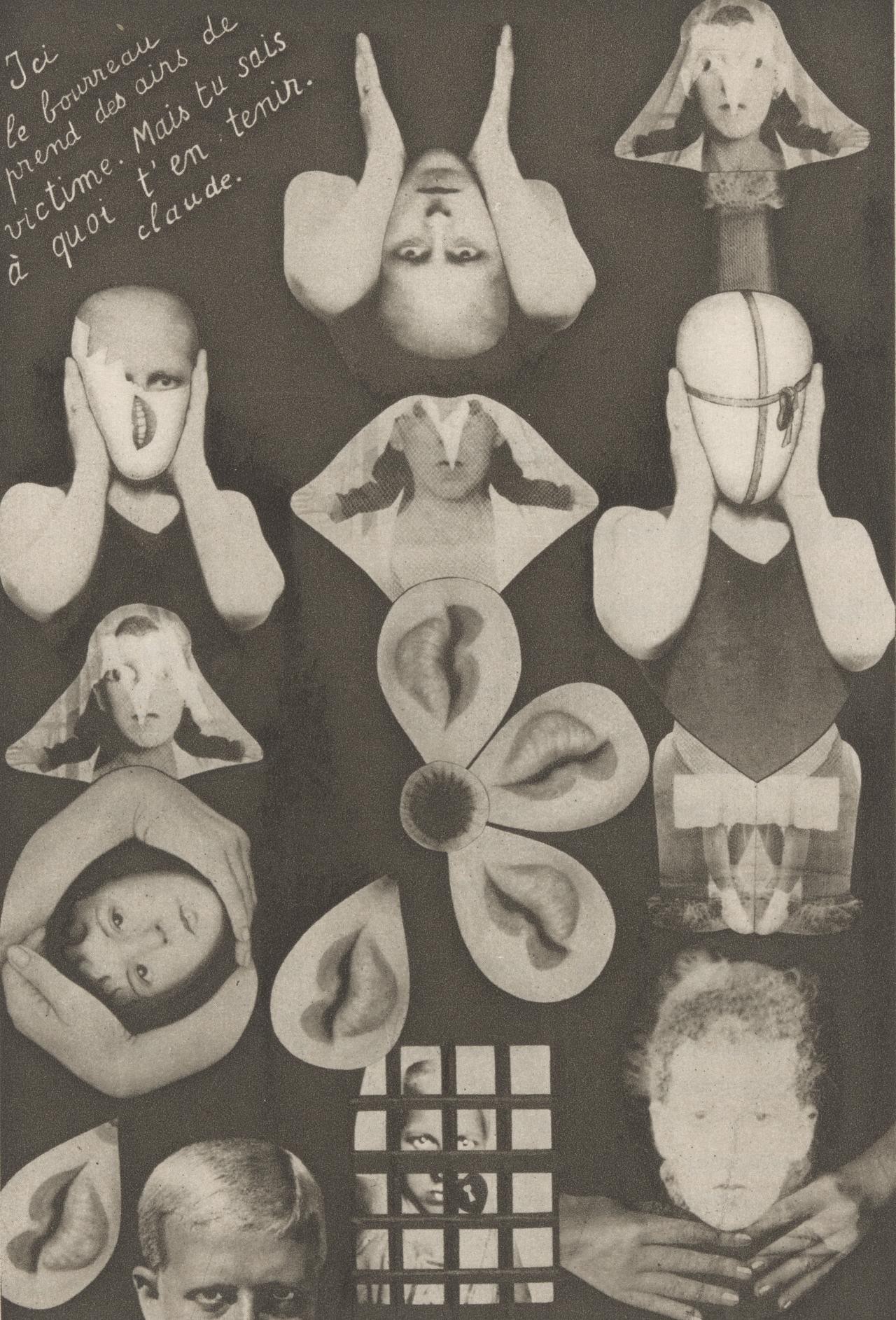 At a time when male Surrealists were exploring the fragile nature of post–First World War masculinity, often by using the dismembered or broken image of the female body, Cahun appropriated corporal symbolism as a site of resistance to gender normativity, and a means to deconstruct her identity. The photomontages present bodies that are anonymous, androgynous, vulnerable and ambiguous. The body is everything, but the body is an absence.