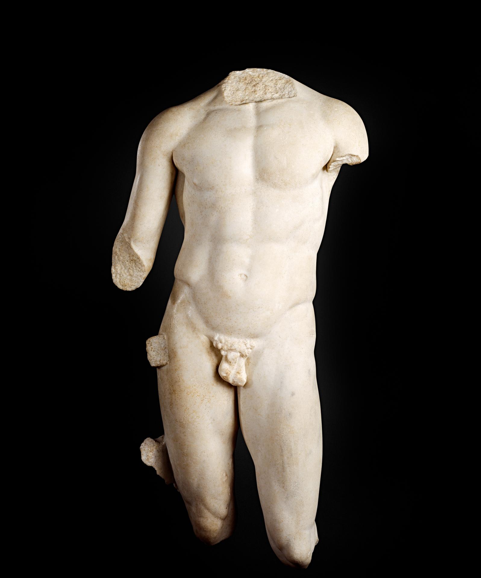 The expressive and highly accomplished treatment of the musculature distinguishes this work from the standard Roman copies, which imitate in a more mechanical manner the flat, broad, simplified musculature of the mid-5th-century style. The more creative adaptation of the Polykleitan type by the sculptor of this piece reflects the influence of the ‘baroque’ style of late Hellenistic sculpture. The exceptional quality of the present work’s conception, execution and preservation marks it as one of the finest surviving examples of one of Polykleitos’s lost masterpieces.