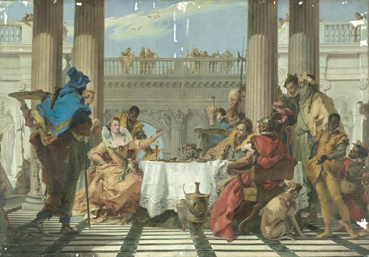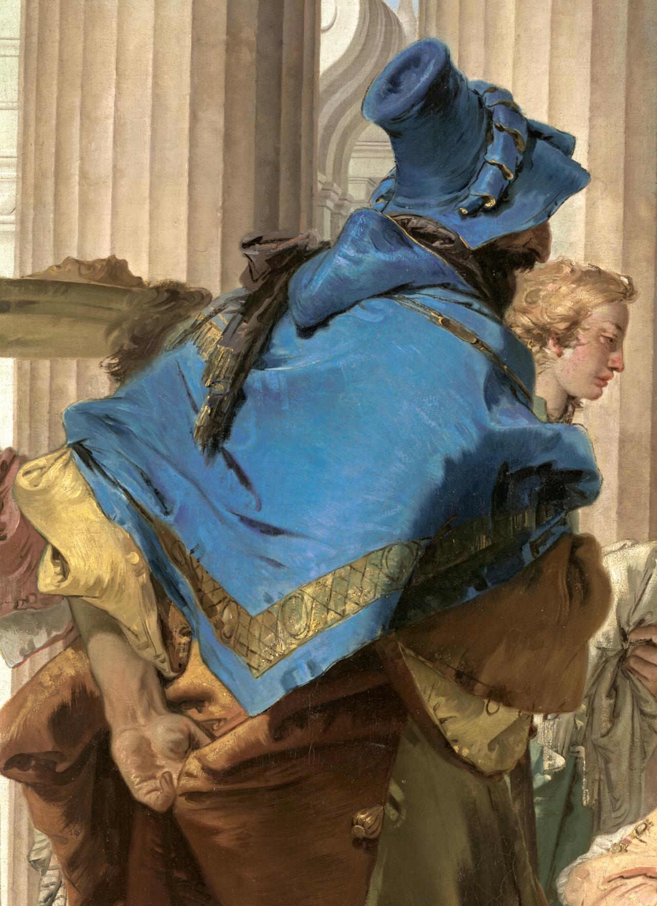 Tiepolo’s rich, colouristic effects are also due to his exploitation of colour and tonal contrast. This is perfectly illustrated by the enigmatic standing figure on the left, perhaps the most complex component of the entire painting. This figure is turned away from the viewer, half-lit, half-shaded and has parts of obscured figures sprouting from his sides. The shadow cast against him introduces an intriguing tonal complexity to an otherwise seemingly conventional, day-lit scene. The striking effect of his blue cape is augmented by the fact that it is contrasted against the warmer tones of the other figures and is the only deep blue of the entire painting. Tiepolo’s desire to single out this figure is also evident in his decision to emphasise his silhouette by brightening the off-white tone reflecting from the fluted column directly behind his face. The artist’s manipulation of tone to enhance the critical components of his visual construction are evident in the crucial central passages of the painting. Here, the architecture behind the table is painted in a deliberately muted tone, quite different from the rest of the architecture which is bathed in strong light. Conversely, the tablecloth where the glass of vinegar rests is brilliantly illuminated, drawing our eyes to the essential dramatic moment of the painting: Cleopatra’s victorious gesture.