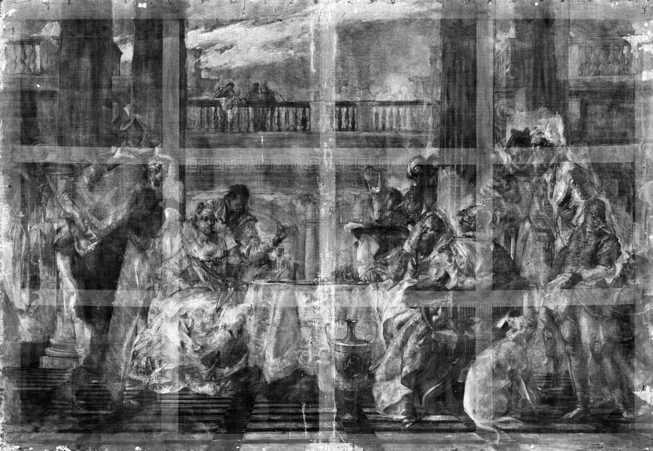 Two significant pentimenti were evident (fig. 5). The first was a compositional change with the architecture in the central passage. The x-radiograph shows that Tiepolo originally planned for the profile of the side buildings to intrude into the central passage of sky between the two pairs of columns (visible in the x-radiograph as shadowed areas by the columns); he later pushed them back, away from the central space and painted blue sky where they were originally intended. The earlier idea is present in a modello of a variant of The banquet in London, but Tiepolo decided – probably for the sake of removing visual clutter – to have a passage of undisturbed sky behind the central scene.
