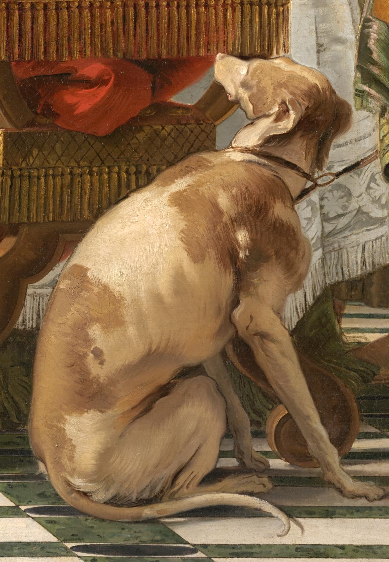 The other significant pentimento shows Tiepolo changing the position of the tail of Mark Antony’s Italian greyhound (figs 6 & 7). The dog, which is painted with Tiepolo’s unrivalled fluency, is modelled on a hound by Veronese in his Esther being led to Ahasuerus in the Uffizi in Florence. Veronese’s dog does not have a tail, sitting as it does on the border of the painting, and Tiepolo was left to create one of his own.The x-radiograph shows he tried two other positions for the tail before settling for the position we see, pulled up beside the dog’s rear leg.