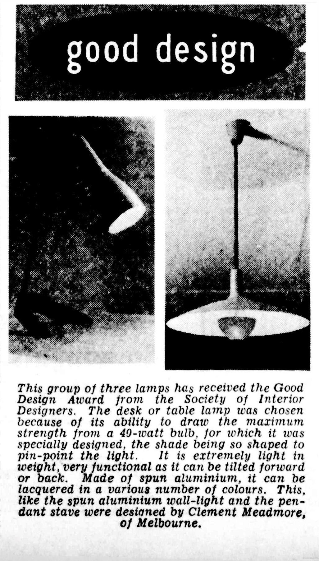 A newspaper article about Clement Meadmore’s Calyx lamps, noting the design creates a focused light and uses a 40 watt bulb. Sydney Morning Herald, 2 Sep. 1954, p. 6. http://nla.gov.au/nla.news-article18453136