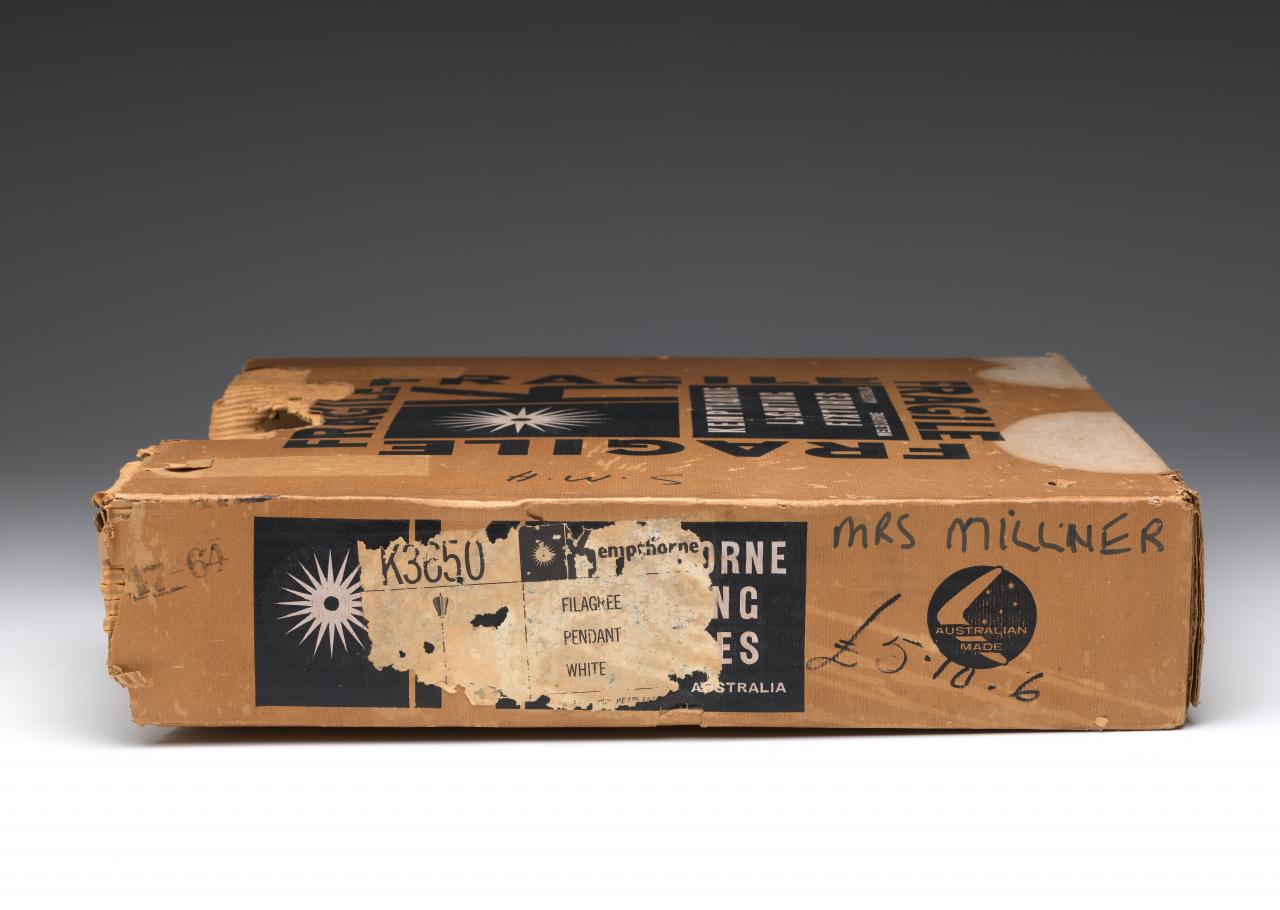 Original box showing manufacturing details for K3650 Filagree, pendant light (c.1964) by Kempthorne and Joyce Coffey