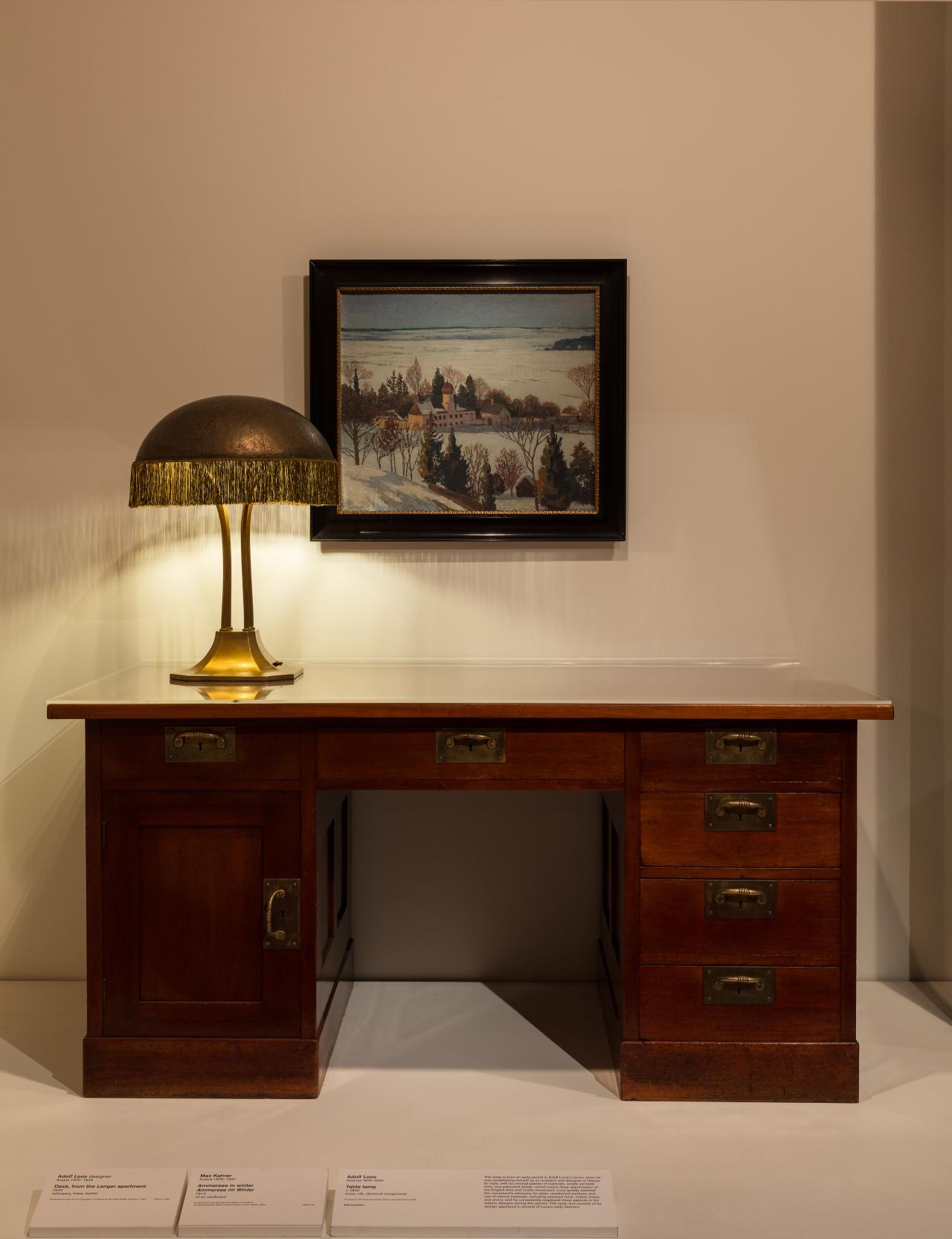 Switching on a lamp clarifies its original design intention: Was it designed to create a soft glow, to illuminate the ceiling, or to spotlight a work area? Our display of Adolf Loos’s early twentieth-century Viennese furniture cannot be disguised as anything but a curated exhibition, however switching on a newly acquired table lamp by Loos from c. 1900 makes it easier to perceive the space as a domestic interior.