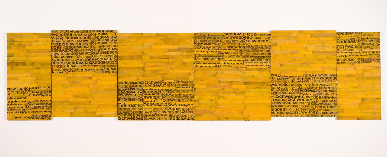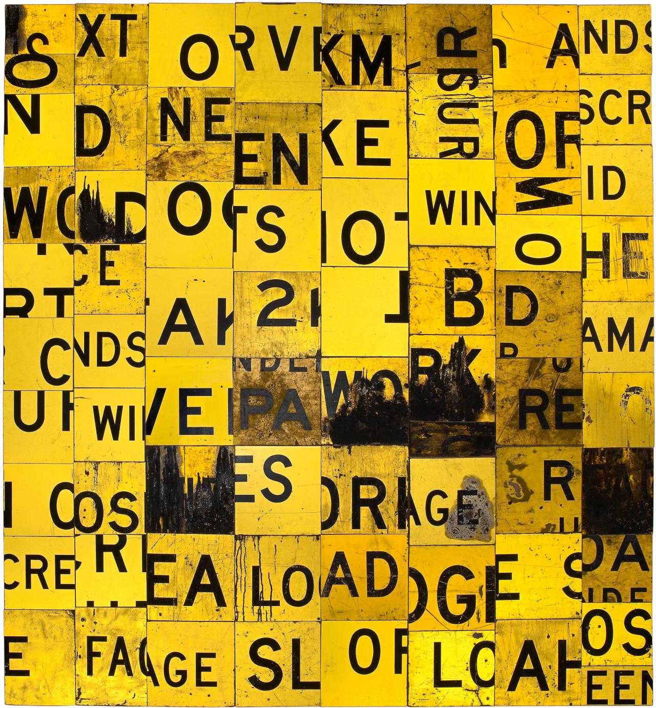 Gascoigne’s use of the boldness of the retro-reflective road signs to reveal her ongoing interest in the expressive possibilities of the grid is exemplified in Flash art, 1987. In this work, Gascoigne has explored all aspects of the featured lettering and negative space, creating whole words, as well as including sections and fragments of text. The title references the reflective quality of the material, with Gascoigne stating that: ‘It was the most blasting of the retro-reflectives I ever did, because it was eight feet by eight feet, it had road tar on it, and when it lit up, boy, it was every bushfire’.5Rosalie Gascoigne quoted in Viki MacDonald, Rosalie Gascoigne, Regaro Pty Ltd, Paddington, Sydney, 1998, p. 76. The gestural smears of black tar across the bright yellow surface additionally links the work back to the roads and highways where the signs were once positioned in the landscape.