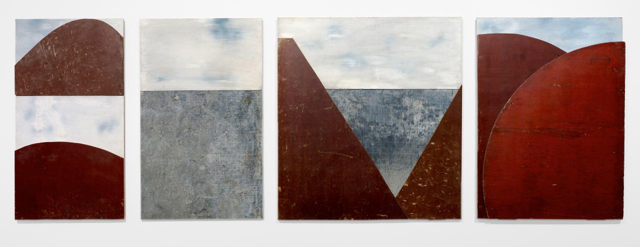 Rosalie Gascoigne is recognised for textural works assembled from collected items, including corrugated iron, wire, feathers and wood, as well as her distinctive wall-mounted pieces formed from split soft-drink cases and brightly coloured yellow and red road signs. Producing work primarily about the landscape, Gascoigne’s art practice stemmed from her appreciation of humble found objects and weathered materials. Gascoigne sourced objects from the Southern Tablelands and the Monaro district, unique natural environments that lie close to Canberra, describing the regions as ‘all air, all light, all space, all understatement’,1Rosalie Gascoigne, interview with Peter Ross, ABC, 1990. as well as building sites, refuse and recycling centres.