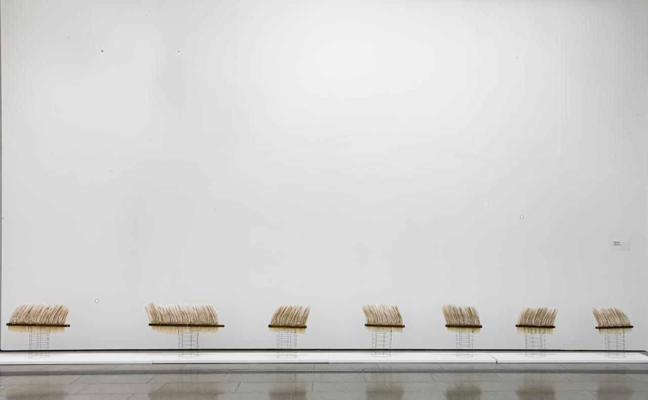Gascoigne commenced classes in the Japanese art of ikebana in 1962, studying under Tokyo-trained Norman Sparnon, who taught the modern Sogetsu school. Ikebana was to significantly inform the basis of her sculptural works. Looking towards line and form over colour, Gascoigne commenced making assemblages in 1964, her first works created from discarded rural machinery. In a similar way, the materials that Connelly-Northey works with are both natural and inorganic, combining items such as discarded wire, metal and scraps of old housing, with wood, shells, feathers and other naturally occurring media. In bringing together disparate materials, Connelly-Northey also uses her work to push audiences to consider the relationships between First Peoples and settler societies, and critiques the ongoing dispossession that is experienced by Aboriginal people throughout Australia.