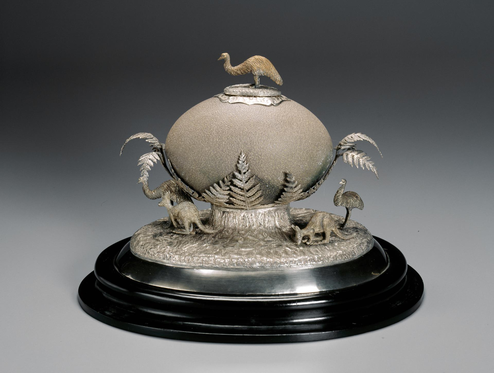 Using emu eggs to create vessels, or as simply decorative objects, can be traced back to as early as 16th century European gold and silverware where ostrich eggs featured in art objects. Ostrich eggs were valued for their rarity and rich symbolism. For the European-trained gold and silversmiths who arrived in Australia in the 19th century, the emu egg offered the opportunity to draw on this tradition and to celebrate the uniqueness of their Australian environment.