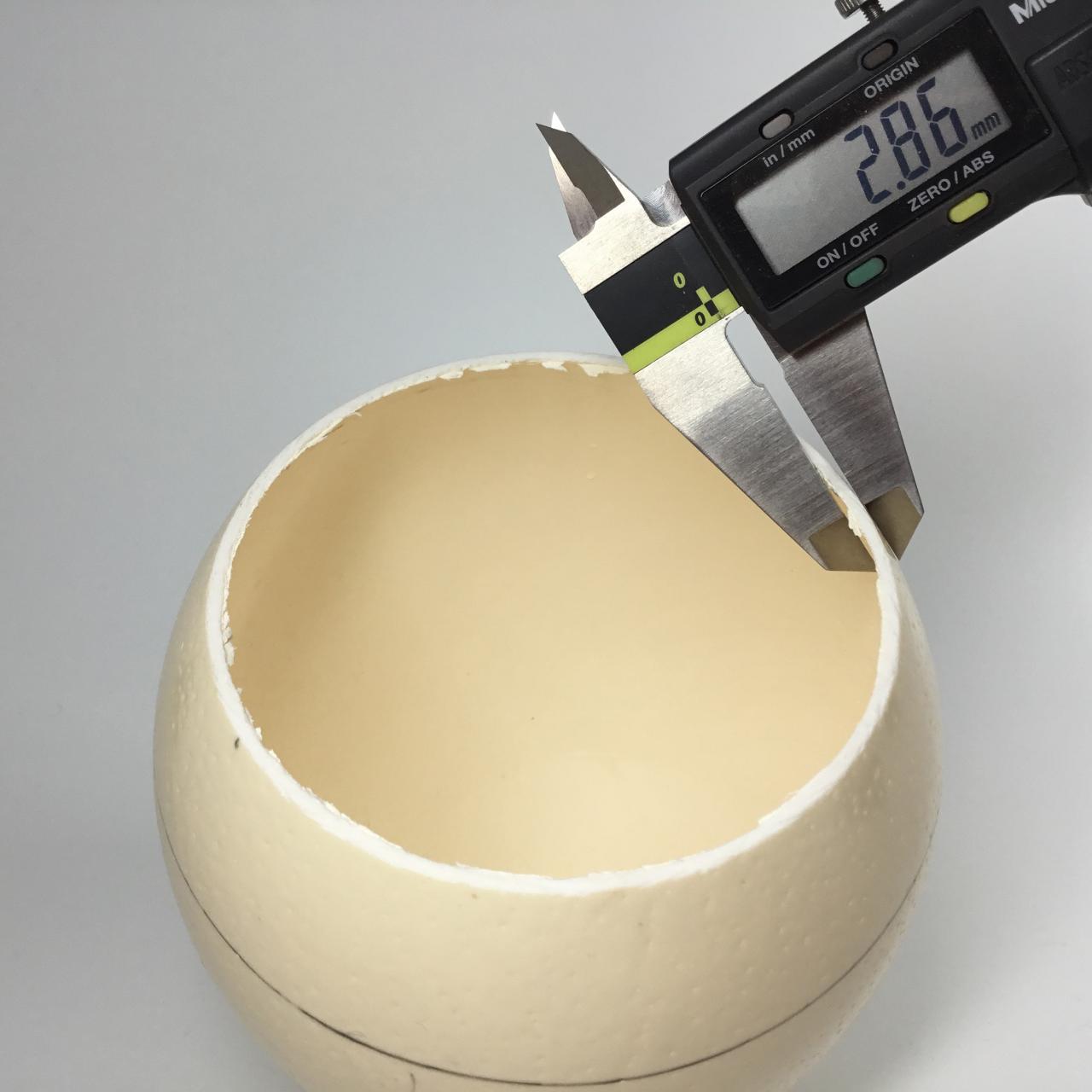 Sawing an emu egg into two halves allowed me to inspect the structure and to examine the inside and extract some useful information. I was able to measure the thickness of the shell, which averages 1.3 mm. In comparison with an ostrich egg, with a shell thickness in the range of 2.5 – 3.0 mm, this is approximately half the thickness.