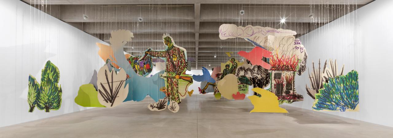 Initially displayed at Tate St Ives as Halilaj’s first solo UK exhibition, Very volcanic over this green feather, 2021, is an immersive installation of hanging forms that metamorphose from drawing into abstract sculpture. This work is shaped by Halilaj’s experiences as a thirteen-year-old living in the Kukës II refugee camp in Albania. The Italian psychologist Giacomo Poli, working within Kukës II, met a young Halilaj and encouraged him to use felt-tip pens and paper to give outline to both the things he had witnessed and those he had imagined.6 The thirty-eight drawings that Halilaj created in 1999 are enlarged, fragmented, printed on felt and tethered from the ceiling. Very volcanic over this green feather begins with a forest of colour, in which a peacock towers over trees and a parrot is perched on air. The action of turning back once within the installation, a gesture synonymous with the past, changes this dreamscape. The forms oriented towards the viewer as they move back to the entrance are representations of human suffering: a soldier wields a bloody knife, a child cries and the facade of a house bleeds black inky smoke. Many of these images are acts of violence that Halilaj witnessed. The encounter between peacock and soldier is a reminder that ‘remembrance is neither what happened nor what did not happen but, rather, their potentialization, their becoming possible once again’.7 Inside this installation imagination and reality coexist.