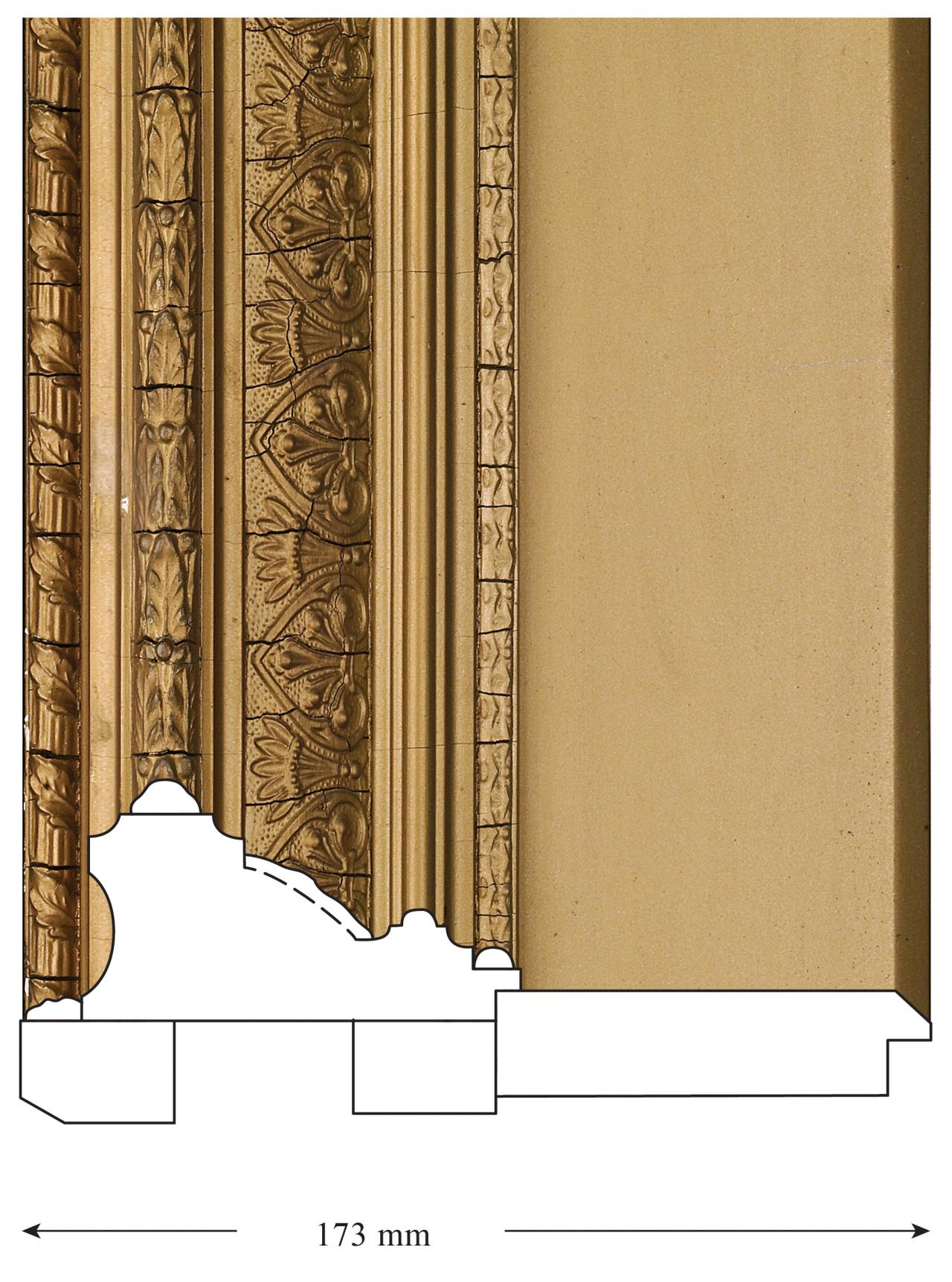 Fletcher appears several times in the NGV’s Gallery Register of Accounts between June 1874 and October 1884 for the supply of new frames and the re-gilding and repair of other frames. However, only two frames in the NGV collection have been identified as by Fletcher, both retaining their framer’s labels. One is the frame for a miniature and the other a large watercolour. The latter frame appears to be composed of lengths of ‘stock’ moulding*A moulding that is mass-produced in lengths, and cut to size and assembled to form a frame. , which has been pre-made and then cut and assembled to the dimensions of the painting. Moreover, the detailed ornament on the main part of the frame looks to have been produced by machine, whereby the pattern is pressed into the moulding material using a metal roller decorated with an engraved design. Given Fletcher’s extensive importation of artworks from overseas it is possible he could have imported these frame mouldings from large European manufactories and cut and assembled them in Melbourne