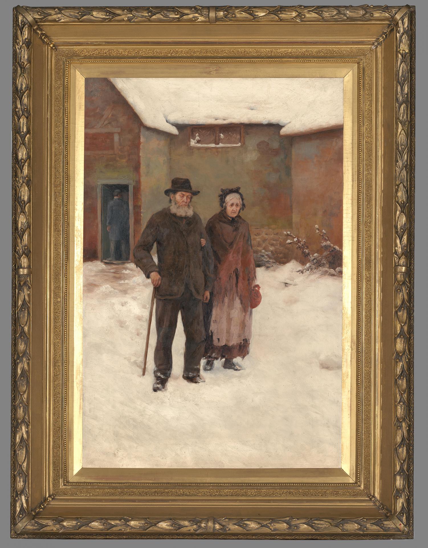 The NGV collection includes one frame with a Gill’s Fine Art Gallery label, on E. M. Boyd, To the workhouse, 1891. The frame is classical revival*A nineteenth century frame style based on ancient Greek and Roman architecture. in style, featuring laurel leaf and berry ornament*Laurel leaves (also known as bay leaves), often shown with their berries, and oak leaves, are two natural forms often seen in frame ornament, appearing as repeated patterns. , as well as a sanded flat.*The application of a granular material to a tacky surface to create a textured effect. Commonly sand is used, but other materials can be substituted for different effects. It is usually applied to flat sections of the frame. An inscription on the back of the frame indicates that it was made prior to acquisition by the NGV in 1893.4John Payne, Framing the Nineteenth Century: Picture Frames 1837–1935, The Images Publishing Group Pty Ltd., Mulgrave, Victoria, 2007, p.100. However, curiously, the address on the framer’s suggests a later dating, between 1906-1912. The reason for this discrepancy is unknown.