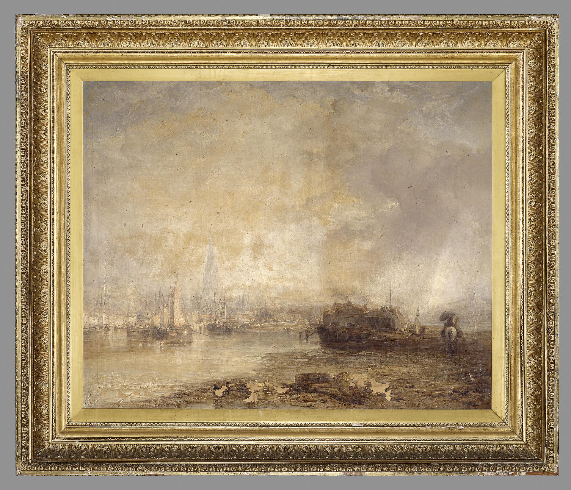 We know of one extant frame by J. Caro, on Salisbury – After the floods by James Webb dated 1887. This classical revival style frame dates to the mid-1890s based on the address on the framer’s label. It is richly ornamented with crisp composition ornament, including acanthus leaves in the main cove and is gilded throughout.
