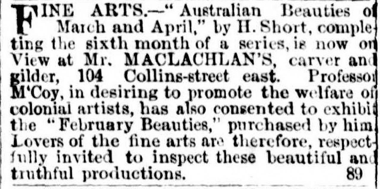 In the 1850’s John MacLachlan, along with R.F. Norton, were the leading frame makers in the rapidly growing city of Melbourne. MacLachlan worked as a frame maker and gilder in Scotland before arriving in Australia in 1853. Two of his sons, Hugh and James, were also qualified carvers and gilders at this time. He opened up a picture framing business on Spring Street, moving to Collins street east in 1857.