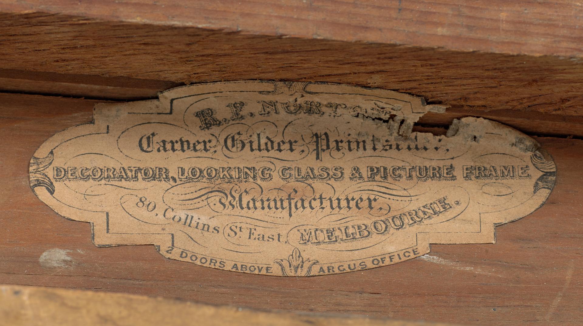 Richard Foster Norton, also known as R.F Norton, was one of only a handful of picture framers in 1850’s Melbourne, with John MacLachlan sharing prominence. Both frame makers were part of a huge surge in migration to Victoria with the discovery of gold in the colony in 1851. Over the decade Melbourne’s population increased from around 20,000 to 140,000.1, Only Melbourne, History of Melbourne, www.onlymelbourne.com.au/history-of-melbourne-581, accessed 22 May, 2020. 2City of Melbourne, ‘1850s: Gold rush’, Building Melbourne, www.melbourne.vic.gov.au/about-melbourne/melbourne-heritage/history/Pages/building-melbourne.aspx, accessed 22 May, 2020. By the late 1850’s Norton was one of ten carvers and gilders listed in the Melbourne business directories.