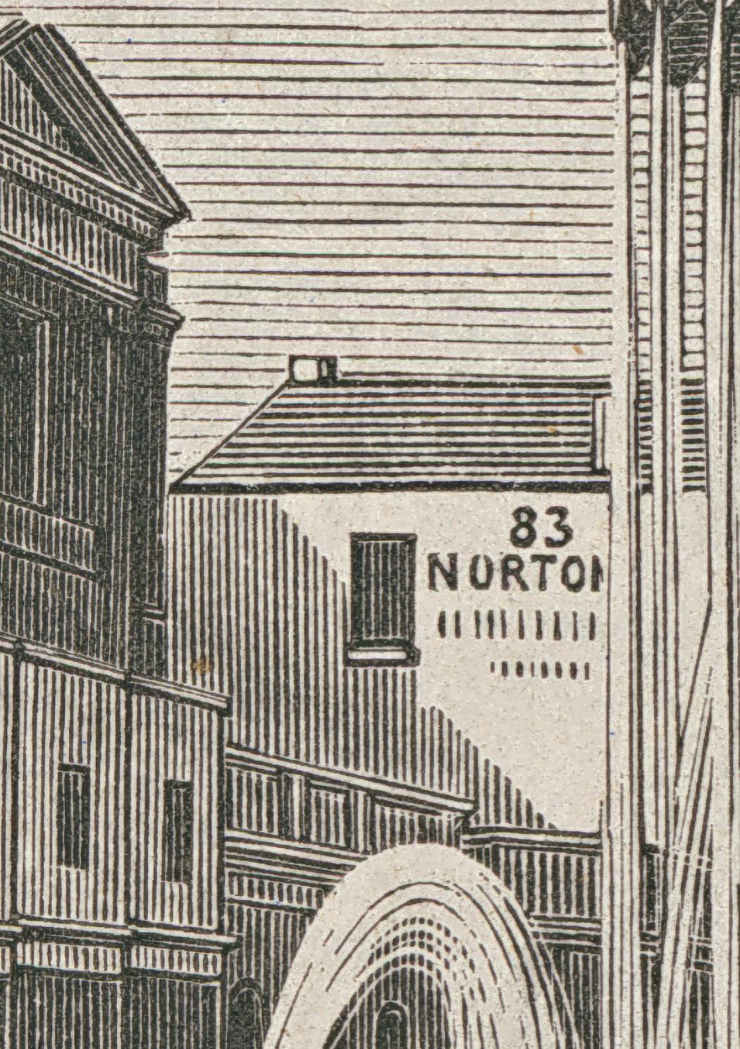 Detail showing Norton’s premises at 83 Collins St East from an engraving The New Fountain, Melbourne, c.1860-1865. Calvert, Samuel, engraver. Pictures Collection, State Library of Victoria.