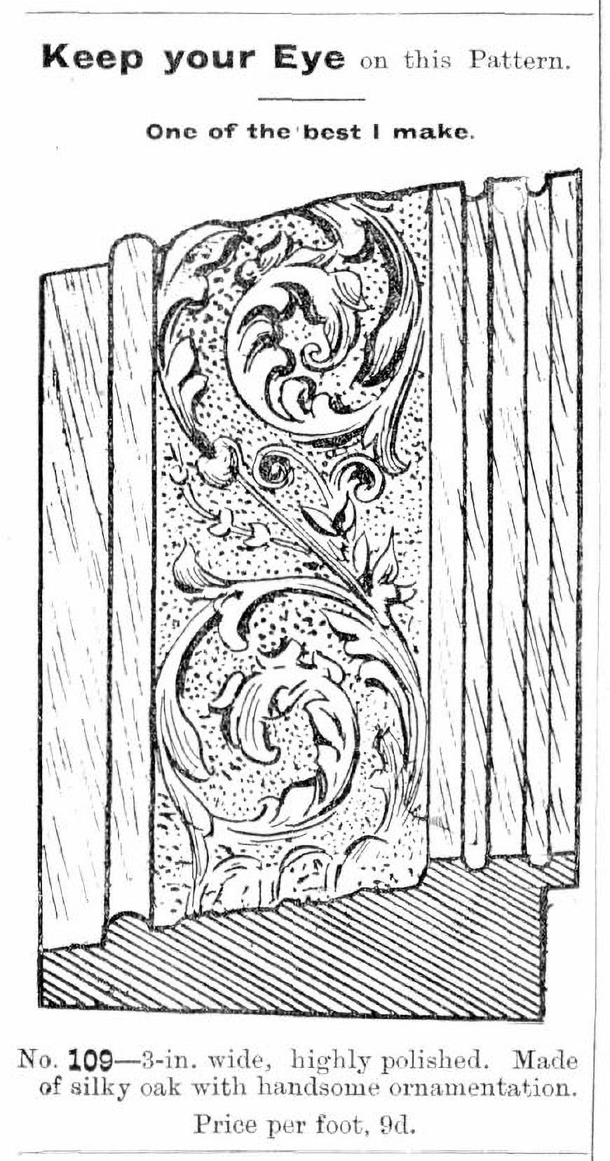 In 1894 Tiller pro-actively self-published and advertised a pamphlet titled, W.J. Tiller’s Amateur Picture Frame Makers Instruction Book, requesting quotes from the printers for 10,000 copies 7A copy of the pamphlet is held by the State Library of Victoria and it was advertised in (amongst others) The Elmore Standard, 22 Jun 1894, p.2, 8The Age, 1 Mar 1894, p.3 In addition to 12 pages of instructions, the pamphlet included drawings of stock frame mouldings (both imported and locally made), composition ornaments, small furniture items available for decorating, silvered plate glass signs for businesses, and the price list for frames made to order. There is also an advertisement to purchase a kit of woodworking tools required to make picture frames, marketed as a “useful present for a youth”. The publication was clearly intended to inspire confidence in the quality of Tiller’s products, with terms like “Liberal Terms to Good Men” and money-back-guarantees. And finally, he offered complete shop display sets of samples of the approximately 100 mouldings he stocked, presumably with purchasers receiving commissions for orders of his product.