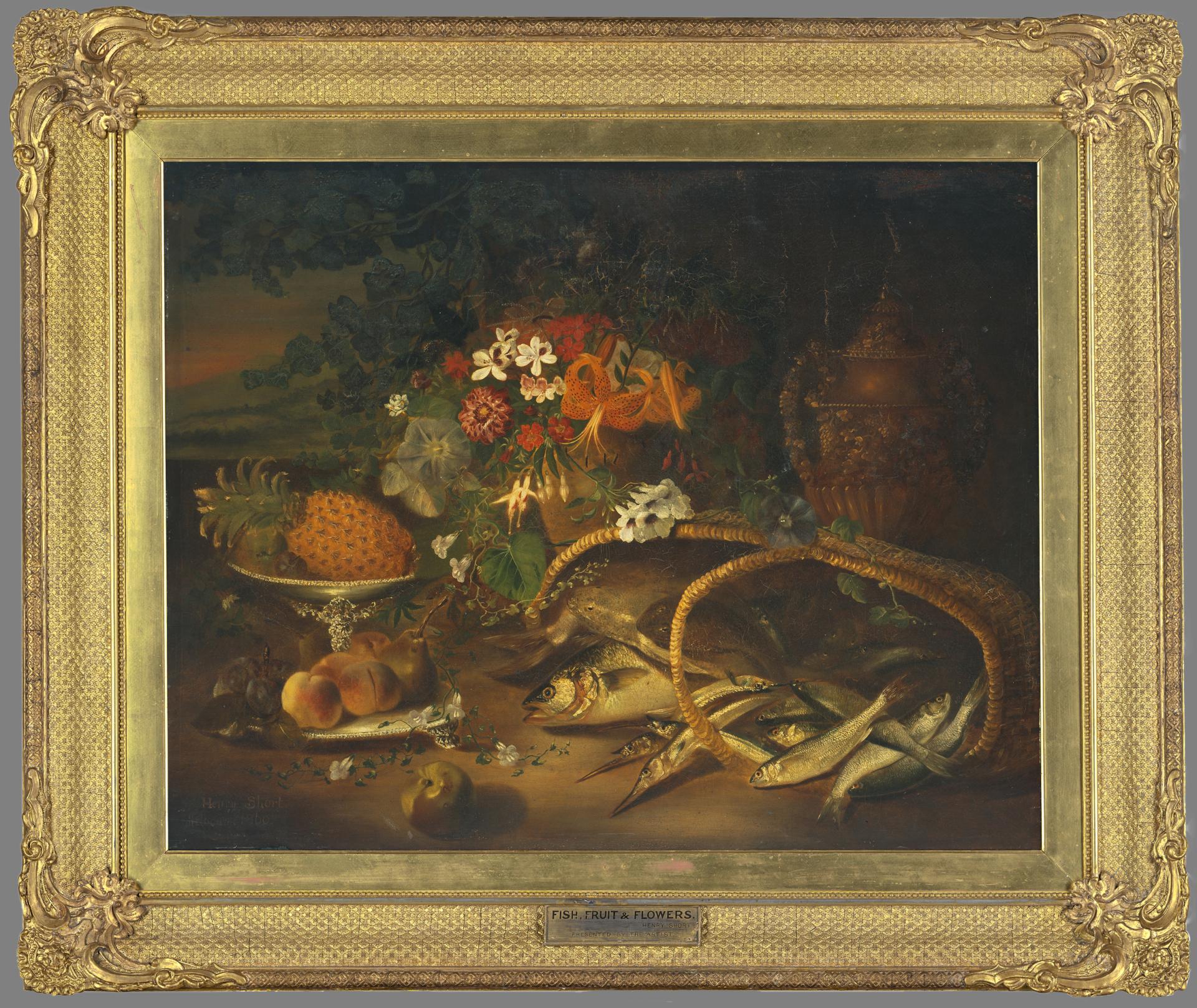 In 1871 Stevens was engaged by the National Gallery of Victoria to make four frames for paintings which were part of a group of works that established the NGV collection. This included an enormous classical revival frame for the painting The Pilgrim Fathers: Departure of a Puritan family for New England by Charles Cope. At this time Stevens also framed the first Australian painting to enter the NGV collection, Fruit, fish and flowers painted by Henry Short in 1860 and gifted by the artist the following year. The frame produced by Stevens appears to be the first framing of the painting and features an ogee*A term used to describe a frame moulding with an S-curve profile. profile decorated with an intricate diaper pattern and prominent corners.*The ornament of a picture frame that extends beyond the straight sides, especially at the corners or centres. The shape of the profile and decoration on the frame lengths appears to be based on the frame for Autumnal showers by Scottish artist Peter Graham, which came to the NGV in 1869. However, the corners appear to be unique to Stevens, appearing on another of his frames in the NGV collection.