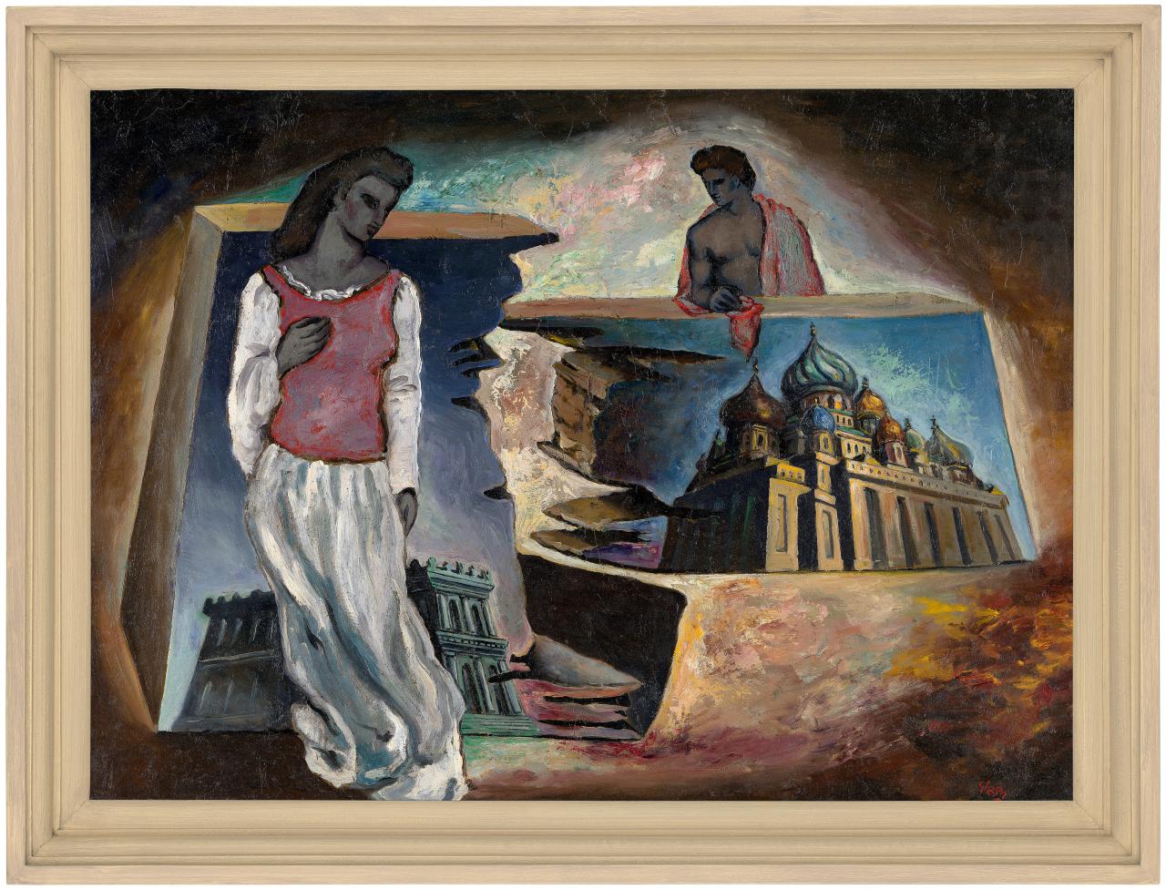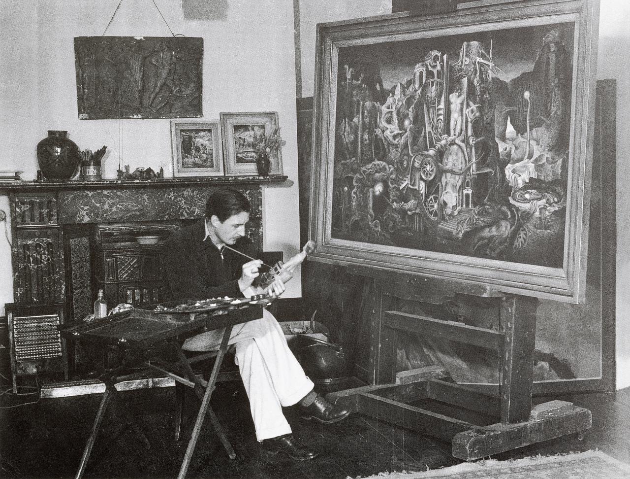 Artist James Gleeson in 1948 with the painting The agony in the garden, 1948, which has an inner frame similar to that on the NGV painting Facades. The image of its frame was used as the basis for the re-creation of the outer frame for Facades.5Image from Lou Klepac James Gleeson: beyond the screen of sight, the Beagle Press in association with the National Gallery of Victoria, 2004, p. 66.