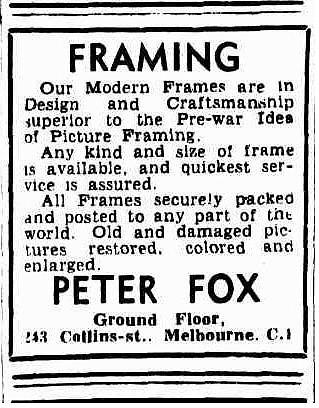 Peter Fox Framing advertisement, The Age, Melbourne, 6 March 1947, p.7.