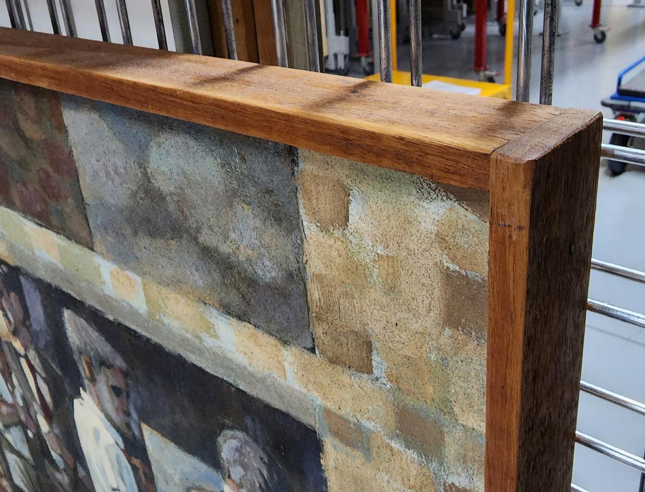 Frame detail during treatment for Roy de Maistre Arrested movement from a trio 1935. The missing wood was repaired with a cast replacement part, adhered in place with reversible wood adhesive, and subsequently inpainted to match.