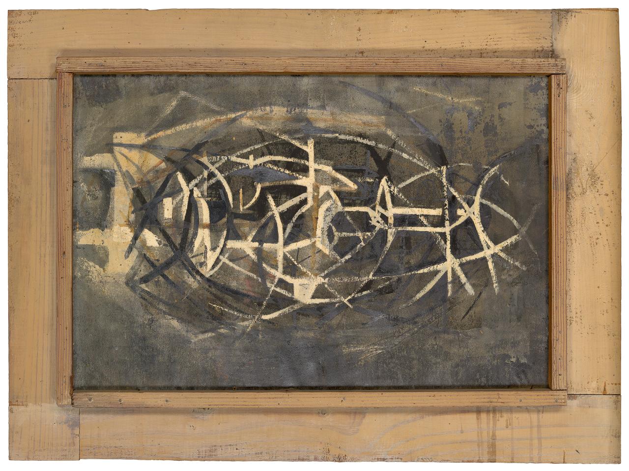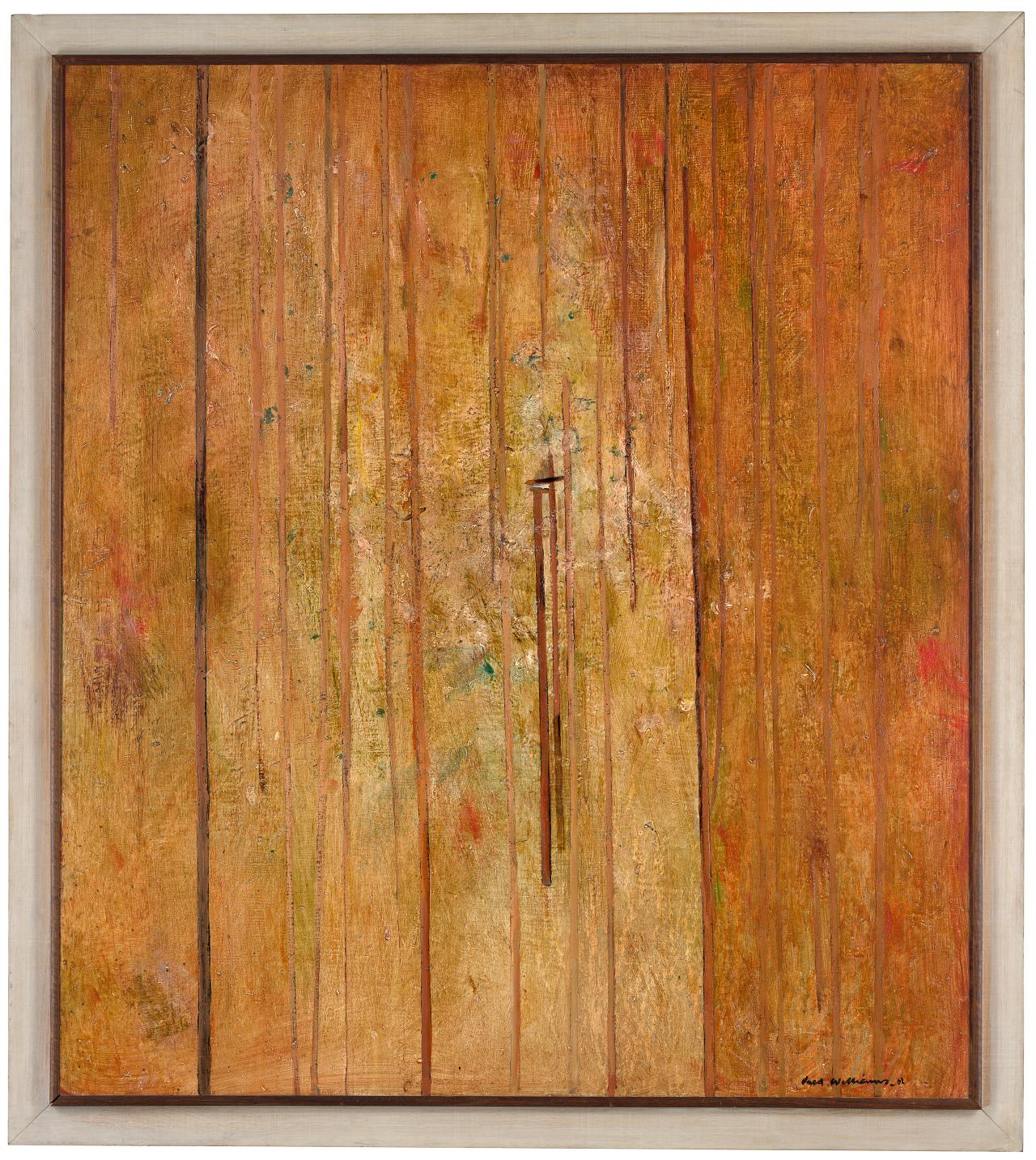 Lyn Williams, email to Kirsty Grant, 17 March 2010. Stuart Purves of Australian Galleries said the 1958 frames were made by Martin Smith. Later, Williams often selected commercial mouldings with patinated metallic finishes to make his frames.3As evidenced by original frames on works by Williams in the NGV and other collections.