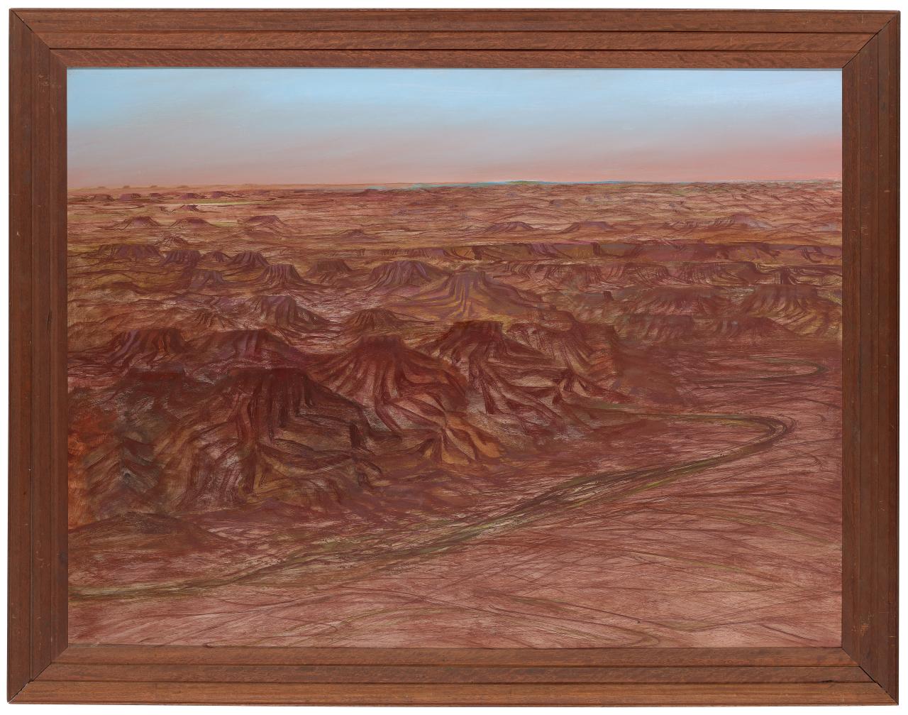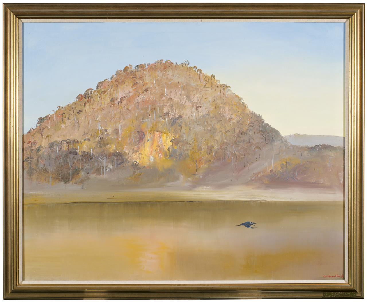 Due to necessity, as well as aesthetics, a growing number of artists made their own frames, or recycled older frames through rubbing back and painting over the surfaces. Melbourne-based artists Fred Williams and John Brack were among those known to have made their own frames, especially in the earlier stages of their careers. Williams designed and made the hand-painted frame, with black bean timber detail to the inner edge, on Echuca landscape, 1962.1Lyn Williams, interview with Kirsty Grant and MaryJo Lelyveld, 16 March 2010. Several other of Williams’s paintings retain the frames from their first exhibition at the Australian Galleries in Melbourne, including The Nattai River, 1958, made by Martin Smith.2ibid. Nattai River is depicted with other works in a photograph of Williams’s 1958 exhibition at the Australian Galleries.
