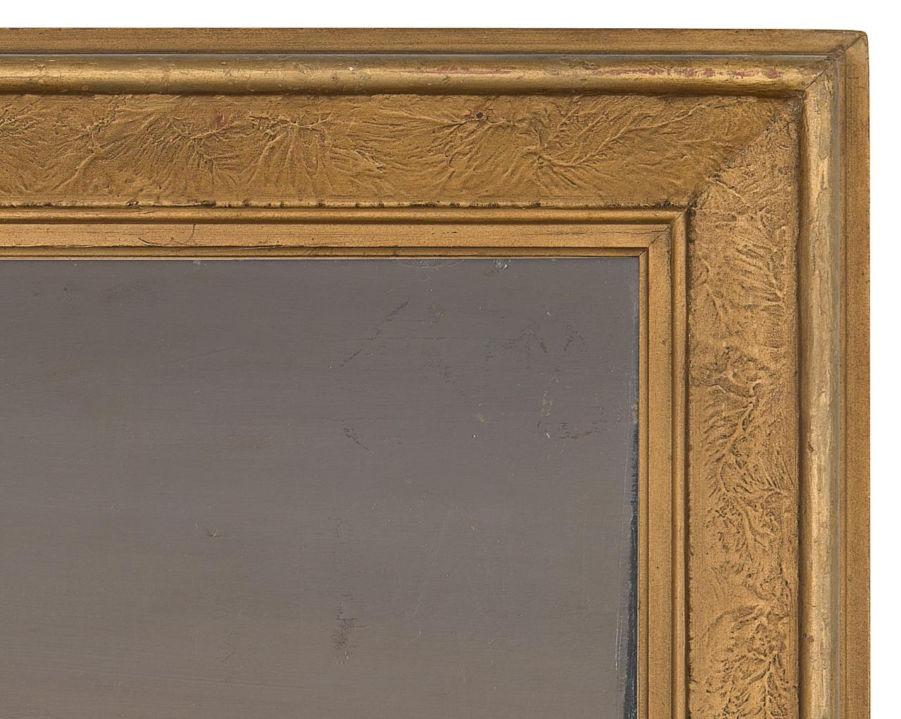 From the 1930s, many frames were similar in shape or profile to traditional nineteenth-century frames, but with less – or often no – moulded ornament. Rather than the bright gilding associated with earlier frames, many early to mid-twentieth-century frames were so called ‘bronzed’, with the application of a darker metallic finishes based on brass powders, or the gilding dulled by rubbing back or applying coatings. In addition, frames were often painted white or other colours, while frames featuring natural or stained timber were also popular. Frames from this period also included innovative stepped frames, consisting of a series of narrower mouldings stacked together to create a wider frame.
