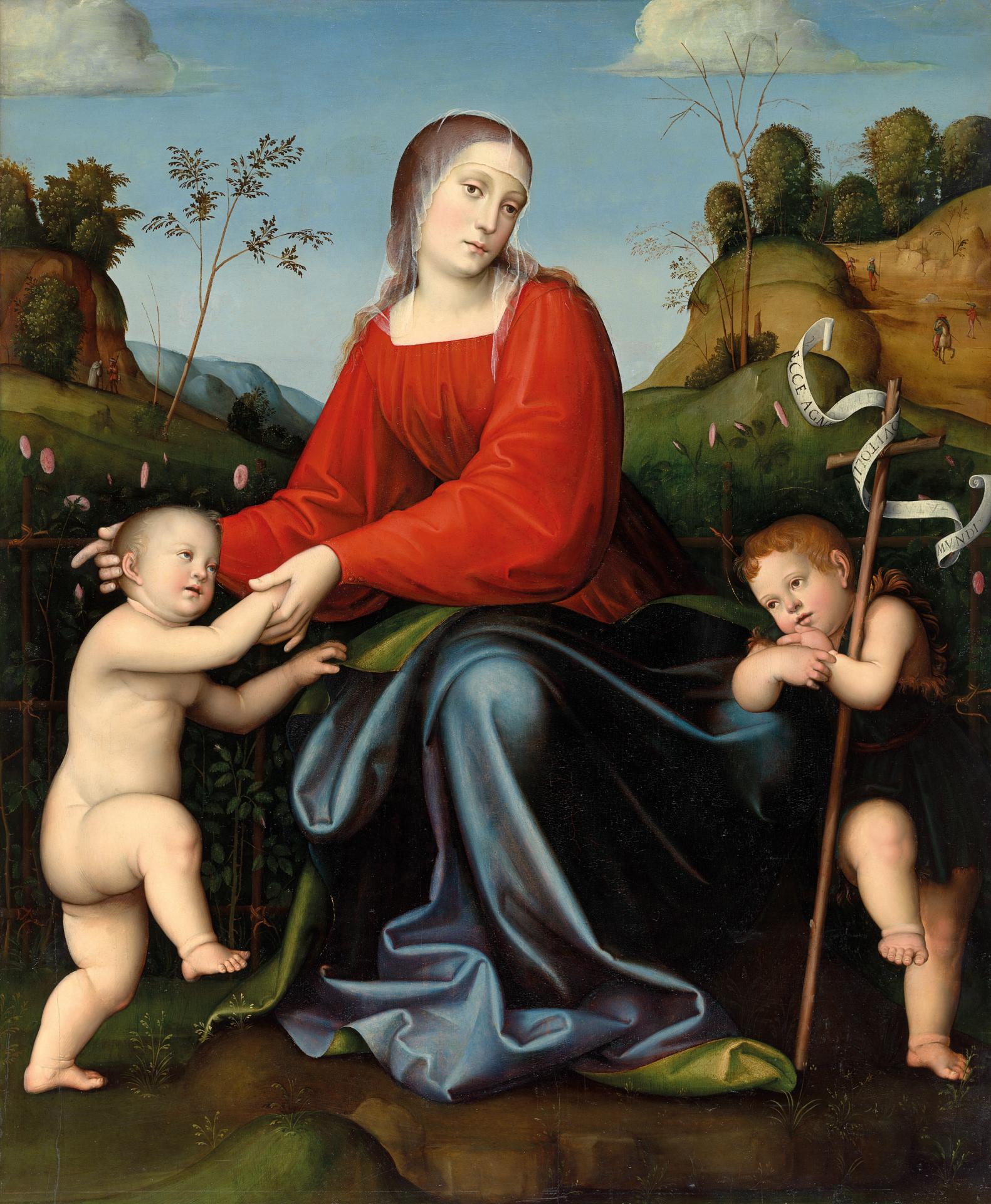 This painting presents a classic Renaissance pyramid-shaped composition centred on the Virgin Mary, who is seated between the two holy children. To the left the baby Jesus gingerly walks towards his mother, while to the right the equally unsteady Saint John balances the group. The trellis of climbing roses surrounding the group forms a hortus conclusus, or enclosed garden, a Franciscan symbol for the Virgin’s chaste self-containment; the Virgin herself was often referred to as a rose without thorns. The landscape in the background is divided into two parts which, again, conveys a religious message. To the right a dead tree stands on a steep path on an arid hill: this is the road of vice, populated by people without belief. To the left a young tree is situated on a verdant, rolling hill where, on a tranquil path, a monk is preaching the Christian message to a pilgrim. This iconography would have been immediately understood by Francia’s audience, while his more naturalistic treatment of the main protagonists may have caused some surprise. Francia here has blended the old fashioned with a more innovative approach to composition and form. His was a gentle way to introduce modern advances in painting to his patrons.