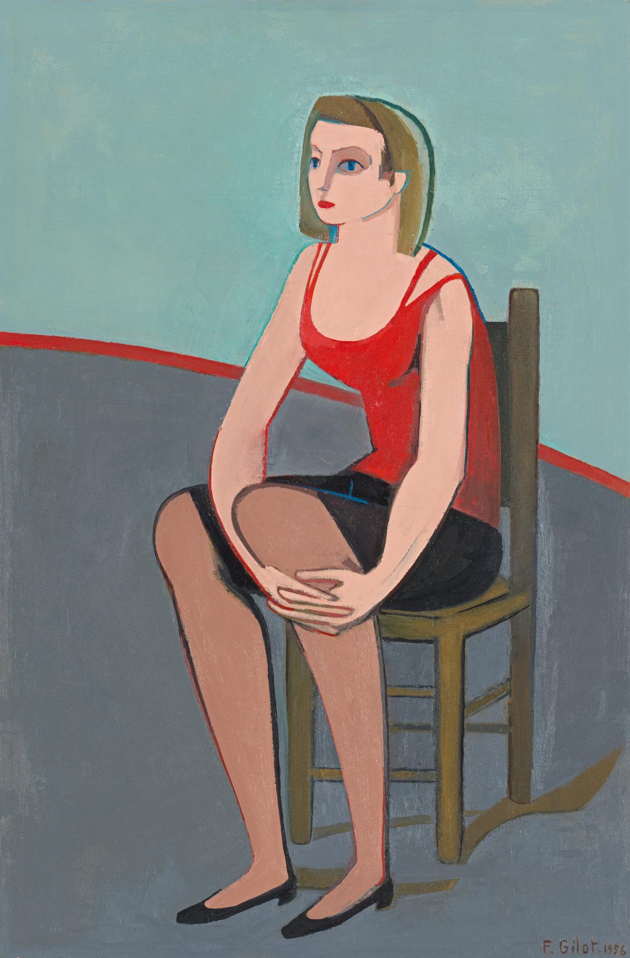 In Blue eyes, 1956, Germaine Brocks is shown seated on a chair in a neutral space with a thin red skirting board, her hands clasped around her left knee, and her piercing blue eyes anchoring the composition. While Brocks often posed for Gilot in ballet costume, here she wears everyday attire that captures perfectly the spirit of modernity in 1950s Paris.