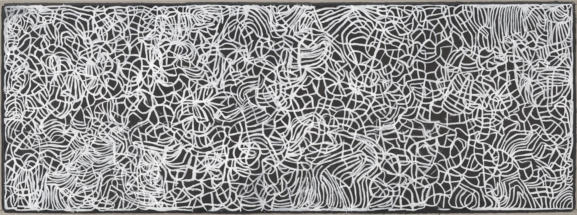 During the 1980s and 1990s Pintupi male artists built on the daring inventions of the first Papunya Tula artists by making the transition from scraps of composition board the size of a man’s body to large canvases. They developed a sophisticated circle-path iconography to represent songlines of named resting places interconnected by travelling paths of Tingarri ancestral beings, and to map the topography of large tracts of land. Moreover, innovators such as Mick Namarari Tjapaltjarri went further by developing a radical minimal style that played on subtle variations of tone, texture and straightness of line within an apparently regular grid. In their horizonless paintings of linear solemnity, Pintupi male artists express their intimate connections with sources of spiritual power in Country and distance themselves from direct allusions to ceremony.
