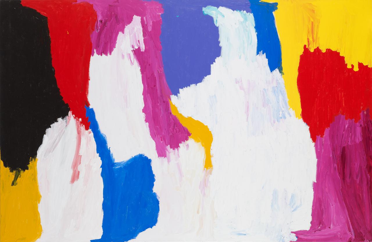 During the 1990s, the great Anmatyerr artist Emily Kam Kngwarray transformed women’s striped body designs from Awely ceremonies into momentous acrylic paintings of her birthplace, Alhalker, and her Dreaming, Anwerlarr (the pencil yam). Unlike early Western Desert works, Kngwarray’s paintings resist interpretation as map, diagram or landscape; her work is not notation, but a daring form of visual music. Kngwarray’s meteoric rise to prominence, acknowledged internationally by her representation at the 1997 Venice Biennale alongside fellow Indigenous artists Yvonne Koolmatrie and Judy Watson, signalled the emergence of Indigenous women as contemporary artists of invention and opened up opportunities for others to work in modern and customary mediums previously unavailable to them.