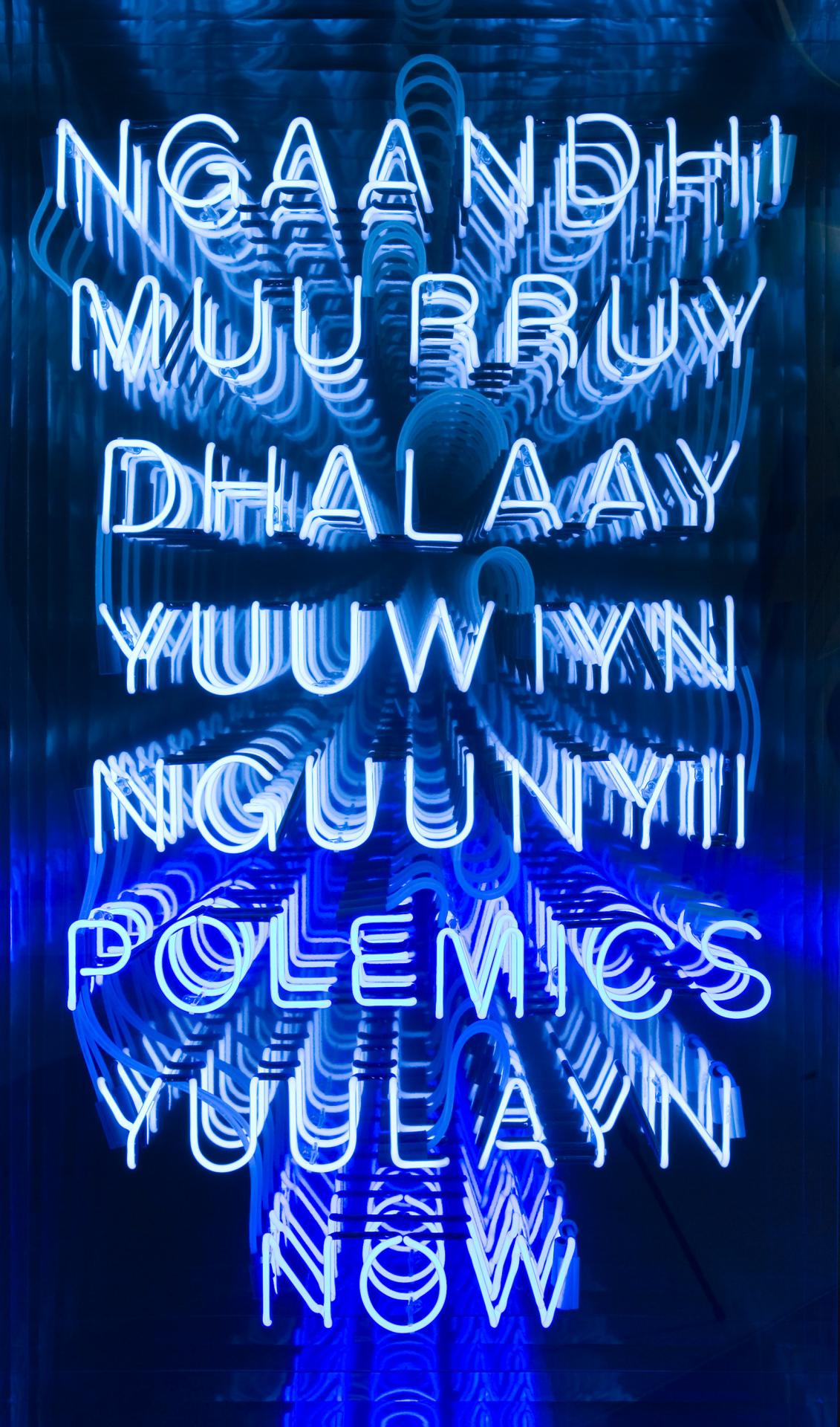 Contemporary city-based artists Brook Andrew, Reko Rennie and Jonathan Jones adopt the language and mediums of contemporary art and popular street culture to give visibility to customary visual and spoken language, to challenge and subvert negative and romantic stereotypes of Indigenous people, and to comment on the racial politics of postcolonialism. Their bold use of neon and fluorescent light juxtaposed against the matte materiality of ochre works on stringybark by Nyapanyapa Yunupingu and Barrupu Yunupingu challenges preconceptions of what Indigenous art should look like and mean and encourages the viewer to question narrow definitions of contemporary art that exclude artists who prefer to work with customary media and iconography.