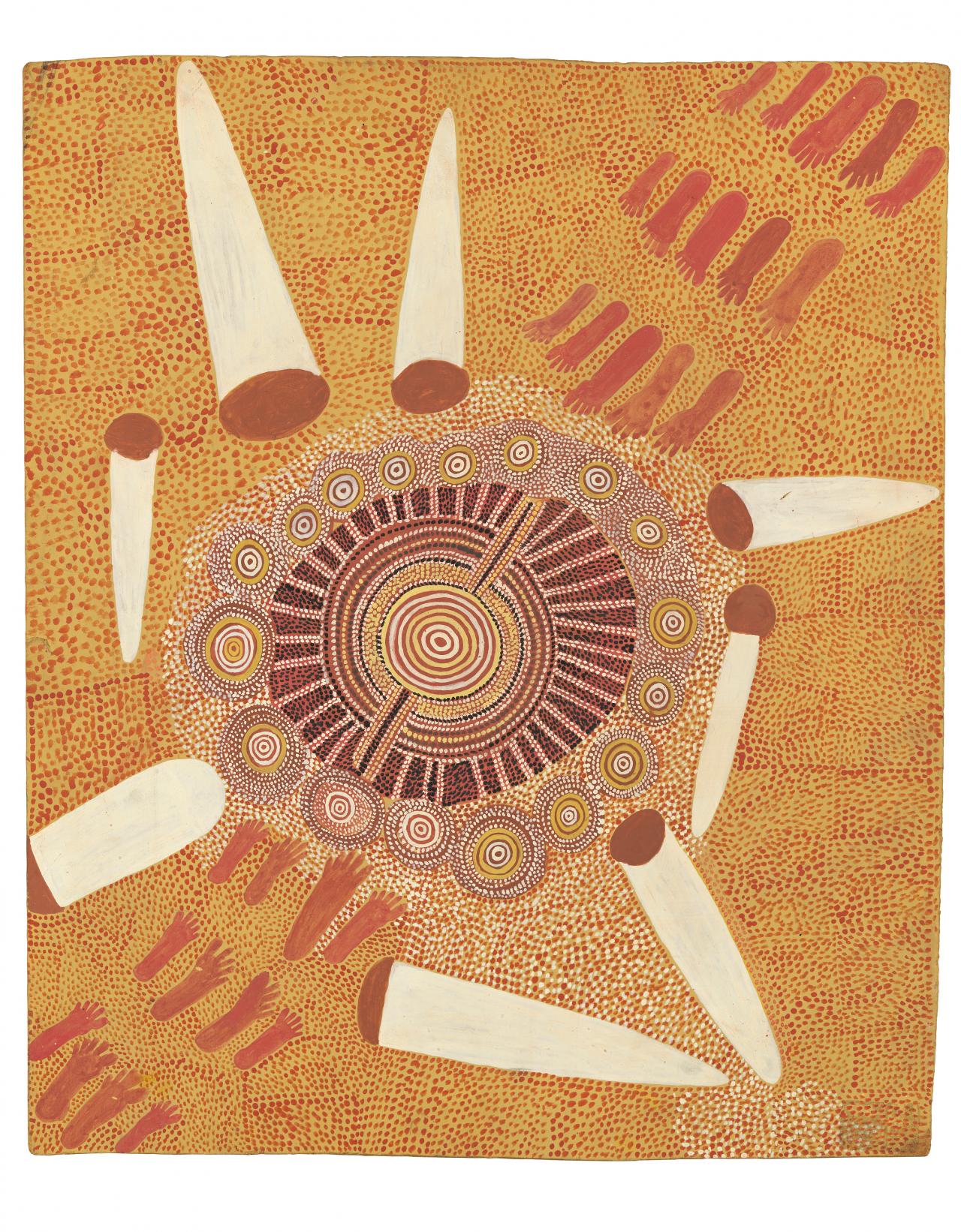 In 1971‒72, the artists who would become the founding members of the Papunya Tula Artists company transformed previously ephemeral ritual designs from body, ground and object into startling paintings of bold geometry and multiple dots that defied then-known forms of Aboriginal art. Through the creation of these acrylic works on scraps of board, artefact became art. Artists used a visual language of concentric circles, geometric symbols and dots to conceptualise place and the presence or trace of creator ancestors who entered into and became the land. Papunya Tula Artists, established in 1972, was a precedent for numerous Indigenous-owned art centres now operating successfully across Aboriginal Australia and the Torres Strait.