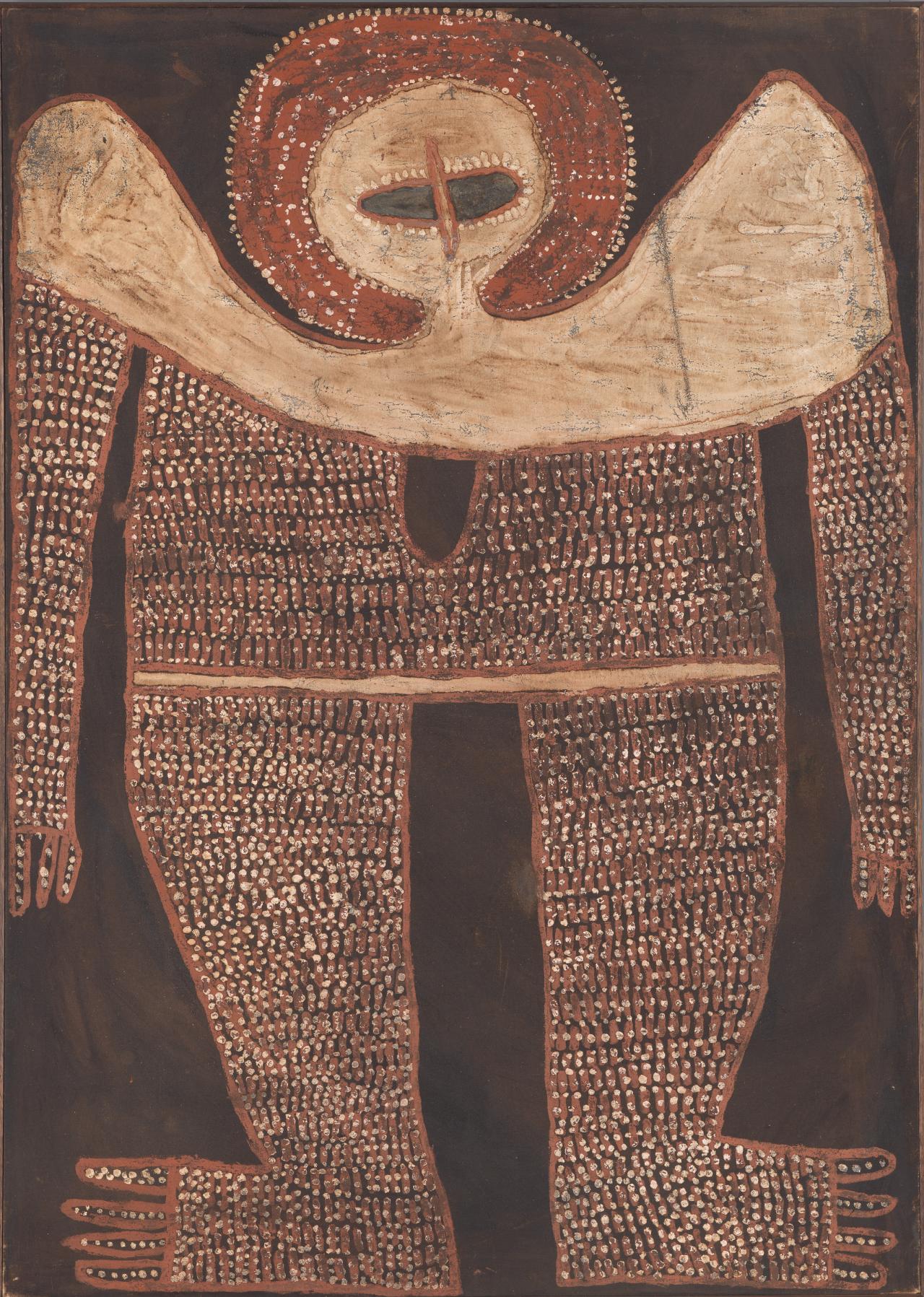 During the late 1950s until the early 1960s, artists living at Minjilang (Croker Island) in the escarpment country of Western Arnhem Land made tangible, as ochre icons on bark, Mimih spirit beings who left their images on rock faces. Paris-based Czech artist Karel Kupka collected and published bark paintings by Paddy Compass Namadbara, Yirawala and Jimmy Midjawmidjaw in Un art à l’état brut: peintures et sculptures des aborigènes d’Australie (1962), contending that they represented ‘an elemental form of plastic art, the source of conceptual representation, conserved in a miraculous state of purity, texture and materiality’.3 Karel Kupka, Dawn of Art: Painting and Sculpture of Australian Aborigines, Angus and Robertson, Sydney, 1965, p. 10 (the English translation of Kupka’s Un Art a l’Etat Brut: peintures et sculptures des aborigènes d’Australie, La Guilde du Livre et Editions Clairefontaine, Lausanne, 1962). The figures stand out in space as living beings in their wholeness, with features omitted, enlarged or distorted to intensify their power and to accentuate their sexuality.