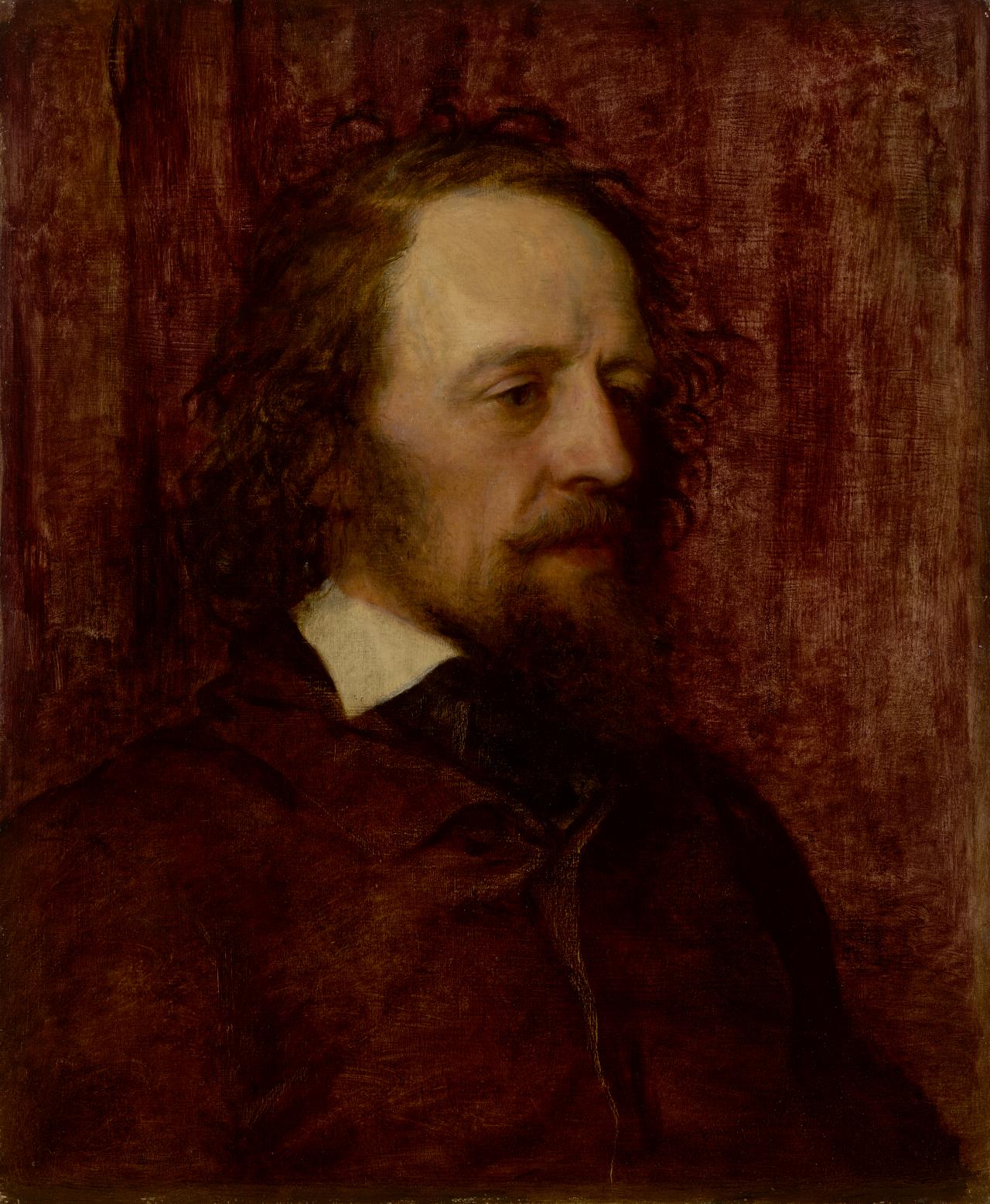 While observing Tennyson in the salon at Little Holland House, Watts requested that the poet sit for a portrait. This was not a commission but a work that the artist intended to keep for his own collection. It was the first of Watts’s six oil portraits of Tennyson, spanning nearly forty years, such was the congruity between artist and sitter. Yet none were commissions, nor did any go into Tennyson’s own collection. After the first portrait, Watts immediately revised it in a new version known as The moonlight portrait (Eastnor Castle, Herefordshire).7