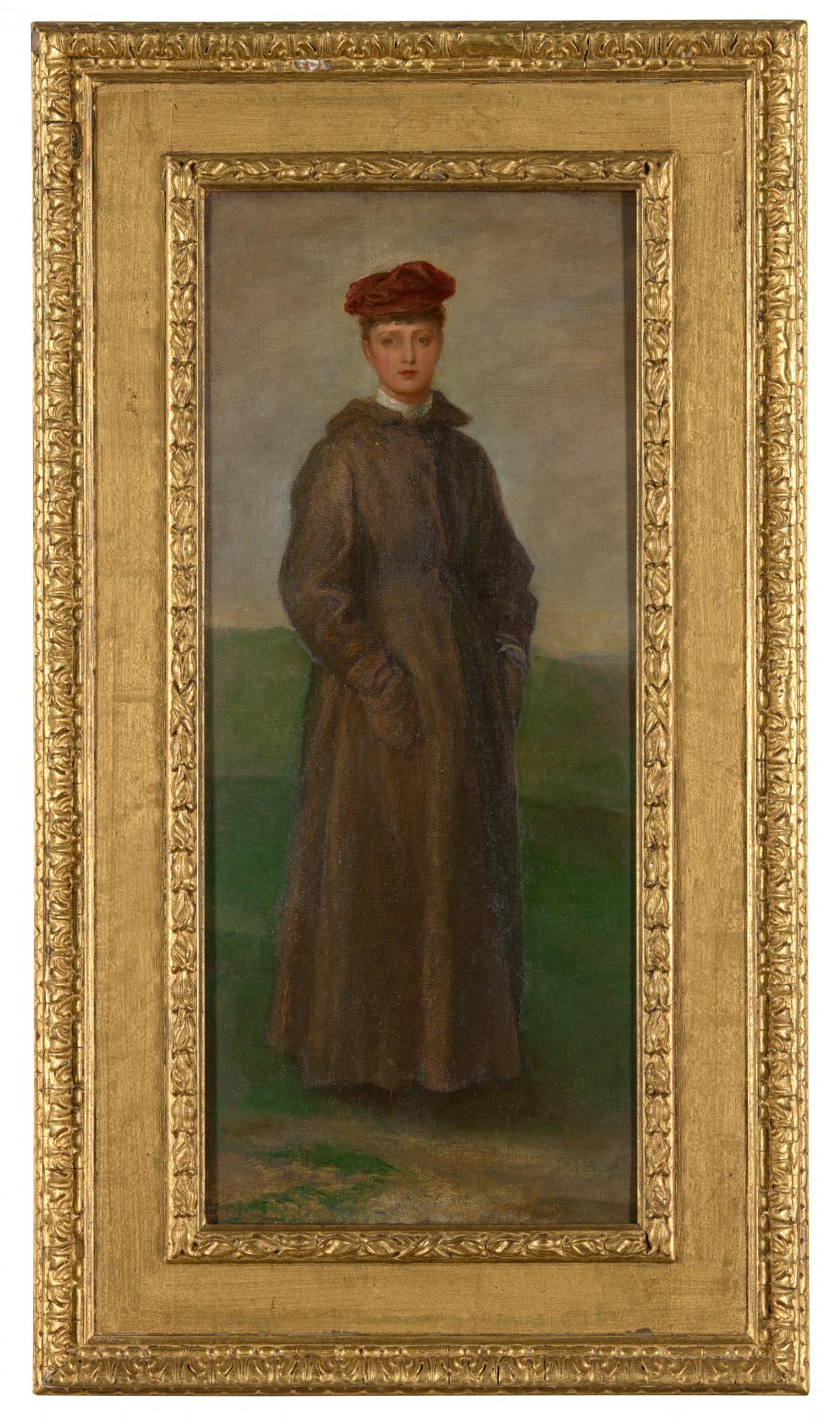 The Isle of Wight presented certain painterly challenges that attracted Watts. Its dramatic views and blustery weather suggested the idea of a new large-scale portrait. In it, May becomes the focus of an imaginary encounter on the hills above the coast. Presented in emphatic frontality, her hands thrust in deep pockets, she stands with no readable expression. She has a firm, direct, even confrontational gaze – one that does not invite the viewer to engage. This is an impressive, if uncompromising, portrayal, disavowing any niceties of conventional female portraiture. Mindful of its unusual qualities, when it was purchased, Watts tried to talk the buyer out of owning such a large picture. However, this was to no avail, and in fact the new owner seems to have been responsible for dubbing the painting ‘The Ulster’. There is certainly a case to be made for presenting it with the title Watts intended: Miss May Prinsep.