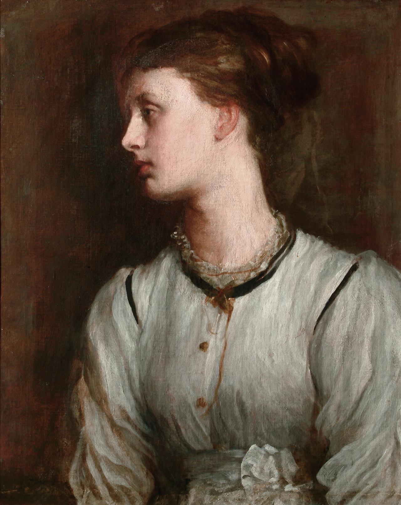 Watts had no trouble selling the painting to his new patron Charles Rickards, a well-to-do lawyer and philanthropist in Manchester, whose family money came from the cotton industry. The patron and the exhibition-going public had a taste for descriptive titles, but the artist considered it a study. In the end he just called it A portrait (fig. 7). Yet it is not a portrait as a character analysis; rather, it conveys a poetic quality. With May turned away, gazing into the distance, there is a wistful mood. The focus is on her fair skin and fugitive profile. In essence, for Watts the painting was an exercise in capturing youthful beauty within a reduced palette of greys and whites.
