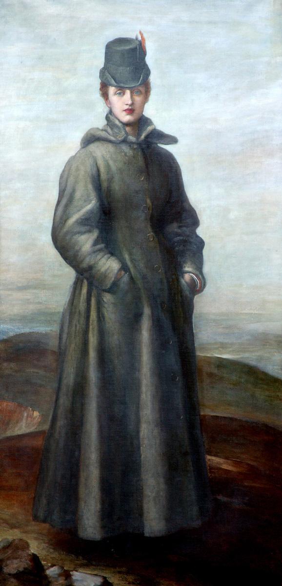 This breezy outpost on the wild and windy cliffs that overlook the coast on the Isle of Wight demanded appropriate outdoor weather gear for walking. Watts’s choice of how to show his sitter has some basis in real life. Even so, the striking presentation of May is provocative. In the full-length painting the long, loose overcoat is more defined in its lines and is identifiable as an ‘Ulster’. Indeed, the painting’s first owner (and others thereafter) called it that. This garment was essentially a travelling or walking coat, double-breasted, cut long and full, with an opening at the back for ease of movement. It had a bold lapel and detachable hood. Initially for men, by the early 1870s the style had also come into fashion for women. The January 1870 issue of The Gazette of Fashion stated: