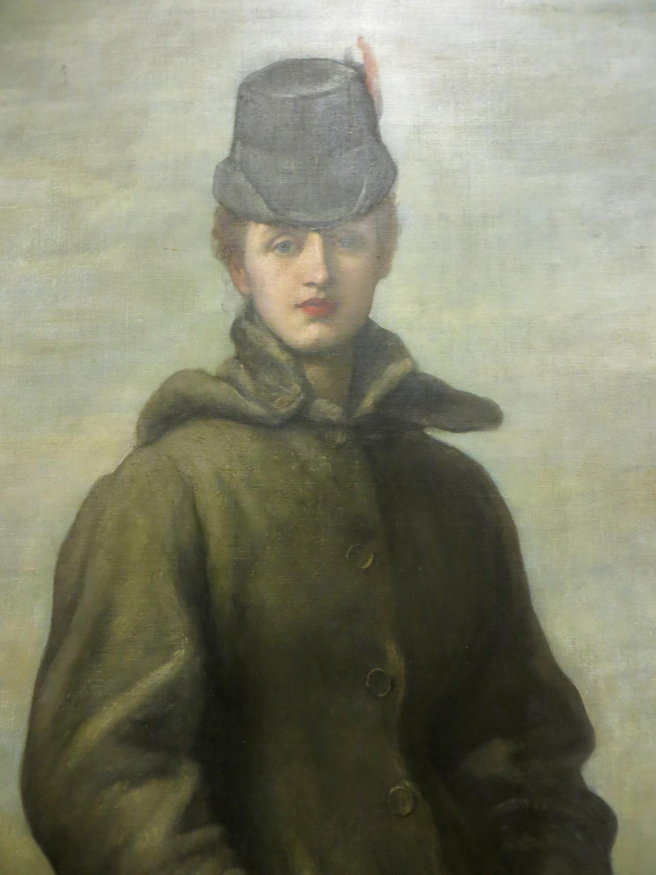 a whole length of ‘Miss Mary Prinsep’ clad in rough and cumbrous travelling dress, with a cap of coquettish if tasteless pattern. The painter has striven to give grace to these unpromising materials, and by his breadth of style and dexterous treatment of texture has thoroughly succeeded. The unpicturesque lines of the long coat are subdued by an admirable arrangement of harmonious greys, and the flesh-painting in this … is most consummate.30