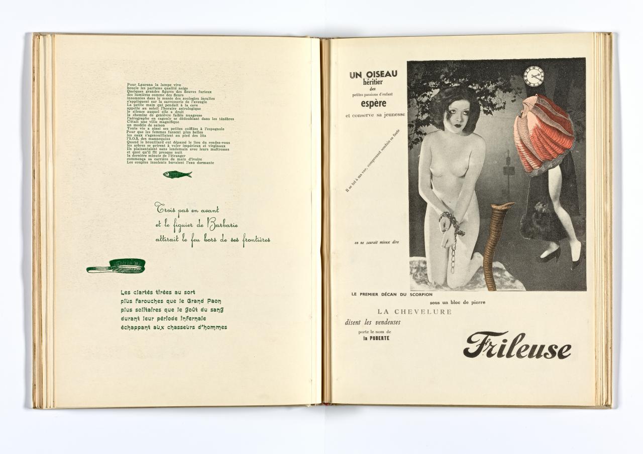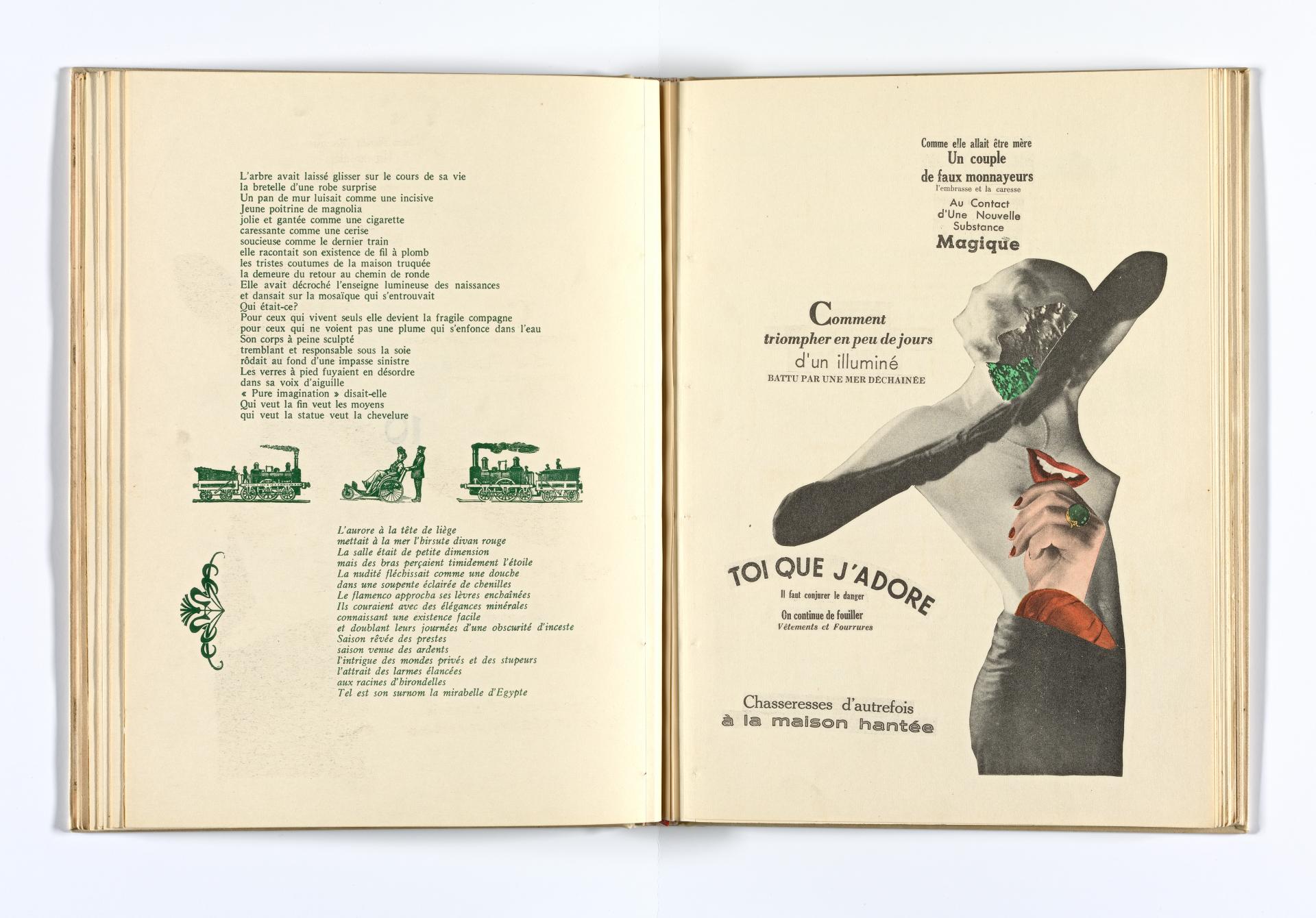 The cover of La septième face du dé was designed by Duchamp and features a photograph of his readymade Why not sneeze Rrose Sélavy?, 1921, above the title. In the book Hugnet describes something impossible: an additional side or dimension to the six-sided die. This typically Surrealist conundrum sets the tone for the following twenty chapters, each of which features one of Hugnet’s poems and an accompanying collage. This type of collage, which combines text with images cut from newspapers and magazines, creates new meanings through unexpected juxtapositions. Like many Dadaists and Surrealists, Hugnet exploited this technique for its potential to disrupt and subvert social conventions and norms. Many of the collages are explicitly sexual: photographs of women’s bodies are cut up into fragments, becoming fetishised through the repetition, layering and juxtaposition of body parts and objects. Text fragments are positioned within and around the pictures, and the final composition is reproduced as a collotype in the book. The poems on the adjacent page are also ‘collaged’, combining words into nonsensical phrases, such as ‘perfumed eyes’ and ‘his insolence was the snow of his blood’.