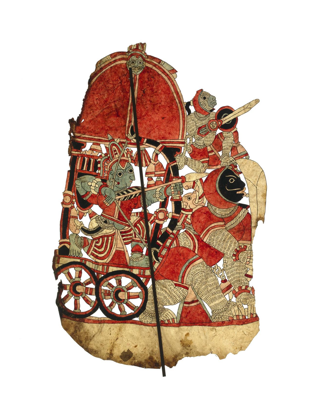 Another subject of works in Gods, Heroes and Clowns is Krishna, the eighth avatar (incarnation) of Vishnu, Preserver of Cosmic Order and one of the most popular Hindu deities. The Krishna narrative has inspired works of art in many forms; those here include a contemporary painted story cloth hung during festivals in Orissa; eighteenth-century Rajasthan court paintings depicting Raslila dance performances held at Udaipur palace in 1736; a Kashmiri manuscript of the Bhagavad Gita; and Indonesian puppets representing characters from the epic Mahabharata, in which Krishna appears as a hero.