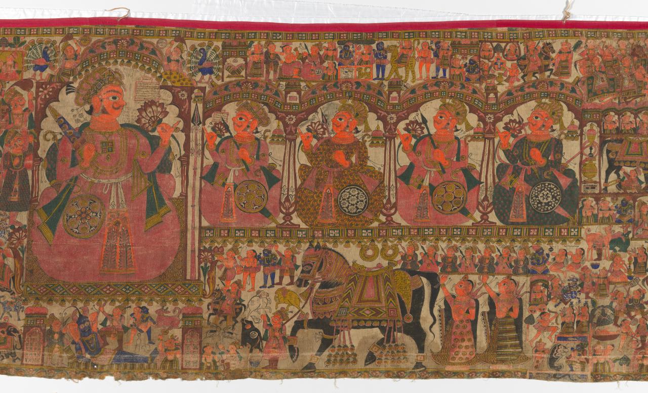 Folk heroes and legends also inform narrative and performative works of art across the region. One of the most vivid and complex examples of such work is a Rajasthan storyteller’s cloth, known as phad or par, dedicated to the legend of the folk hero Pabuji. The cloths originate from south-east Rajasthan, an area of cattle and camel herders, and local legends celebrate heroes such as Pabuji, who protected local communities and their herds. Pabuji is worshipped with the guidance of a non-Brahmin priest known as a bhopa, who performs a night-time recitation of the Pabuji epic with sung accompaniment by his wife, known as a bhopi. The phad/par combines numerous small scenes and figures across a seven-metre cloth. Unlike the linear, chronological composition of the Buddhist Vessantara banner, the par is organised around the large, central figure of the hero according to the spiritual significance of the scene and its geographic location in relation to Pabuji’s village.
