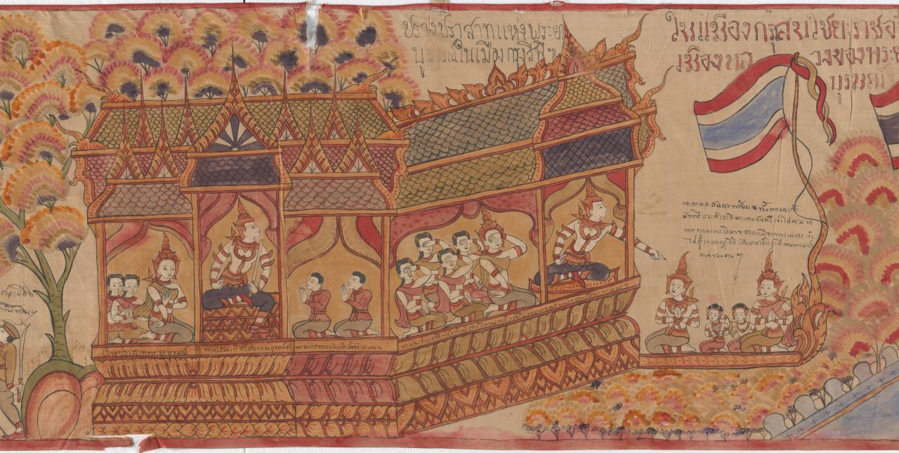 The last ten Jataka tales continue to inform works of art, especially in mainland Southeast Asia. Each illustrates a specific virtue, and in the final tale, widely known as the Vessantara Jataka, Prince Vessantara, the penultimate incarnation of the Buddha, perfects the virtue of charity. Long cloth banners from north-east Thailand and Laos depicting the Vessantara narrative, such as the thirty-eight-metre example included in Gods, Heroes and Clowns, combine performative, textual and visual aspects of Buddhist worship. During the annual Bun Phra Wet festival these banners form a visual backdrop to monks’ recitations of the Vessantara text in the temple hall where they are displayed after being carried in a triumphant procession by the community, in re-enactment of Prince Vessantara’s return to his kingdom.