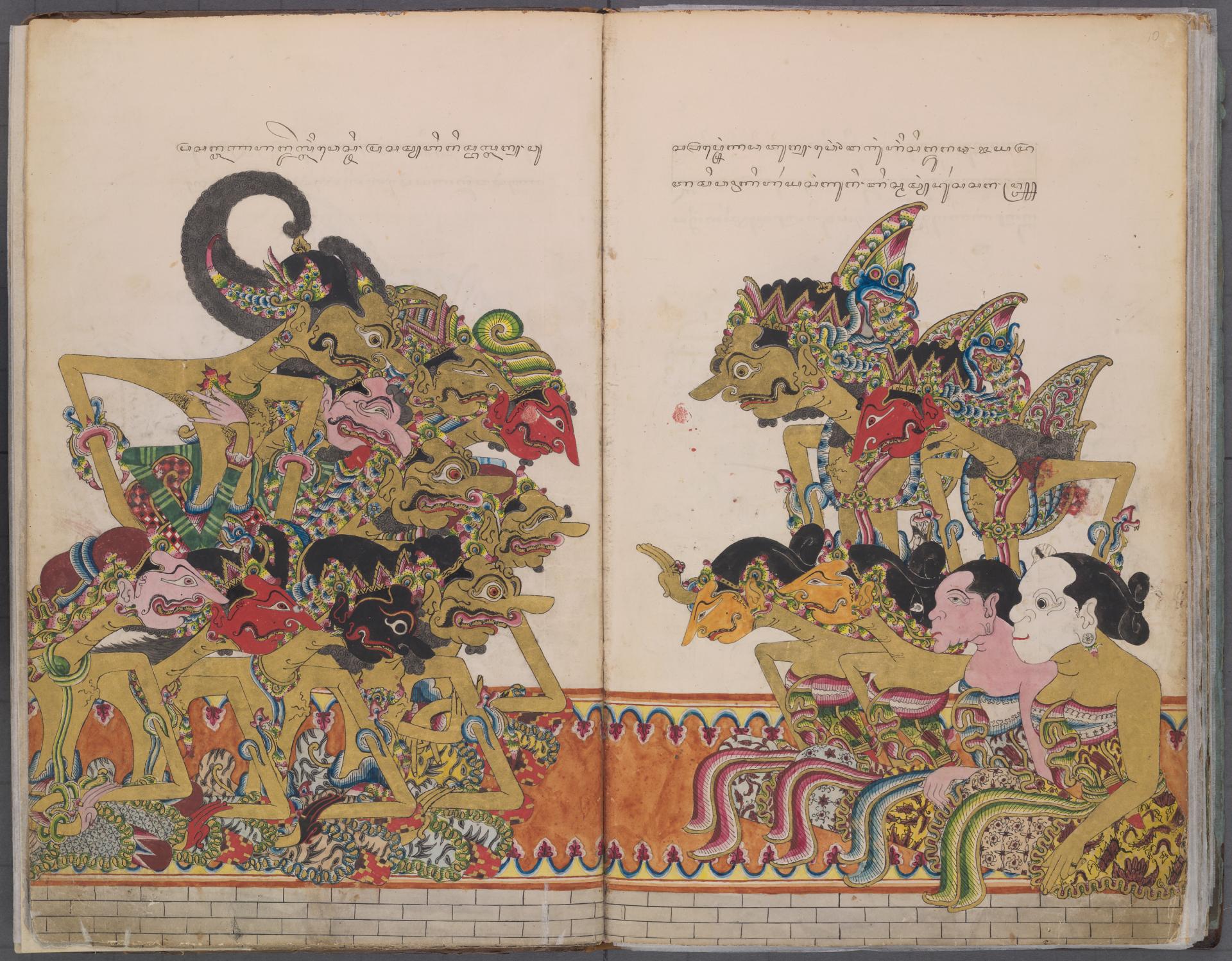 Wayang puppets in Gods, Heroes and Clowns include several depicting the uniquely Indonesian clown-servant characters known as panakawan, who function as narrators, commentators and critics. The wayang style of figurative depiction, featuring figures in profile with squared shoulders and thin, elongated arms, first appears in an illustrated manuscript dated 1886 of the legend of Dewa Ruci. The story is one of the many Southeast Asian embellishments of the Mahabharata and Ramayana. Regional versions of the epics with additions made to the core narratives, such as the Dewa Ruci story, reflect local histories and settings from across the region.